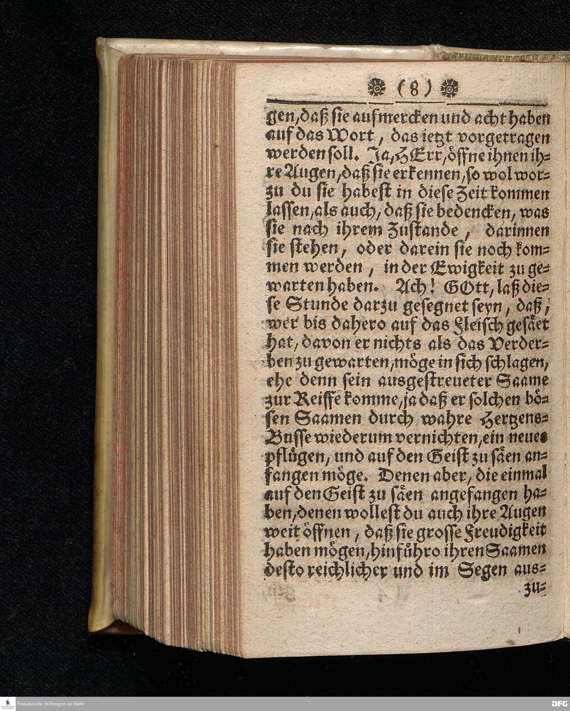 Das Zeitliche Leben als eine Saat=Zeit / In einer Predigt über Galat.VI, 7.8. Am XV.Sonntage nach Trinit. Anno 1709. In der Schul=Kirche zu Halle / vorgestellet von Aug.Herrm.[!] Francken / S.Th.Prof.Ord.und Past. Dritte Auflage. HALLE, In Verlegung des Wäysenhauses. MDCCXXIX.