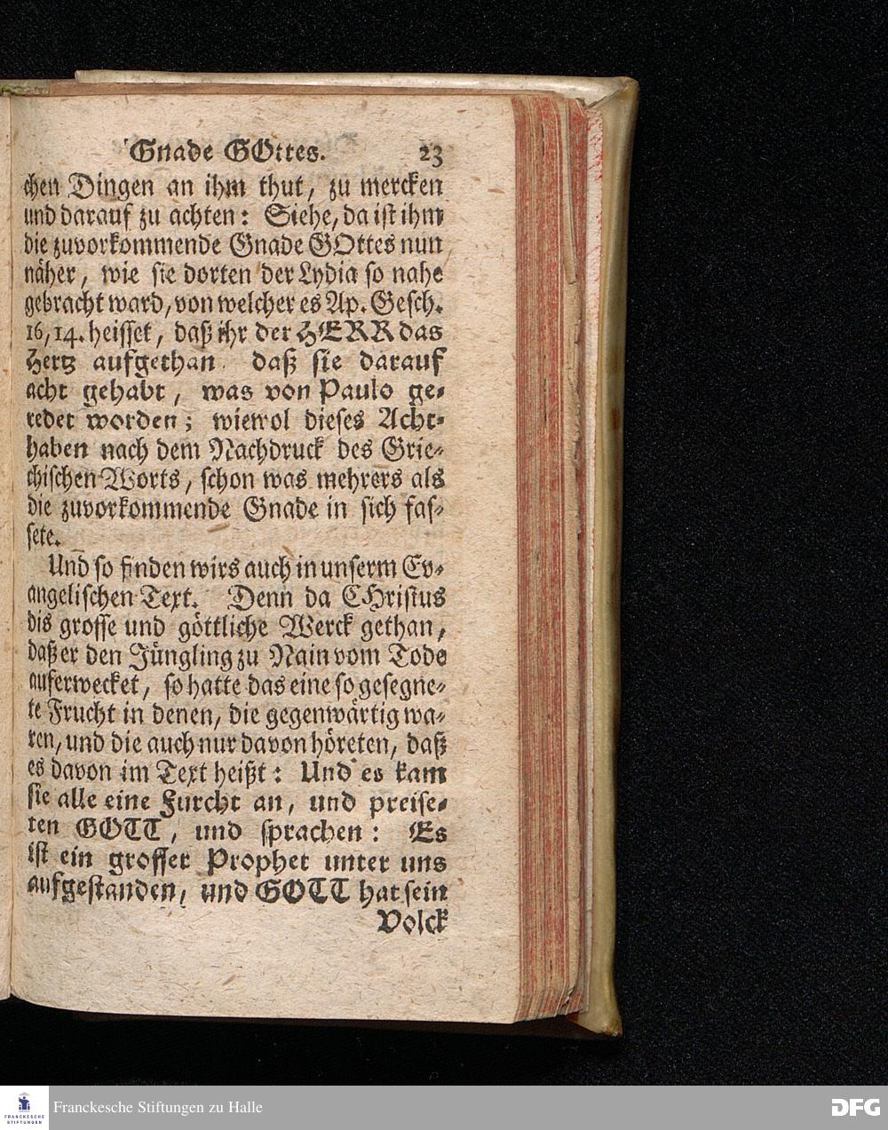 Die Zuvorkommende Gnade GOttes, In einer Vor dem hier versammleten Hoch=Fürstl.Dessauischen Regiment am XVI.Sonntag nach Trinit.1721. gehaltenen Predigt aus dem ordentlichen Evangelio Luc.VII, 11-17. In der Schul=Kirche zu Halle vorgestellet von August Hermann Francken, S.Theol.Prof.Past.Vlr.& Schol. HALLE, gedruckt im Wäysen=Hause, 1729.
