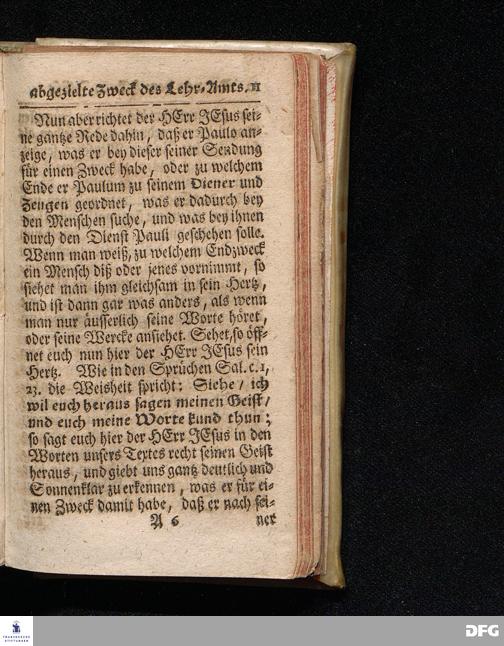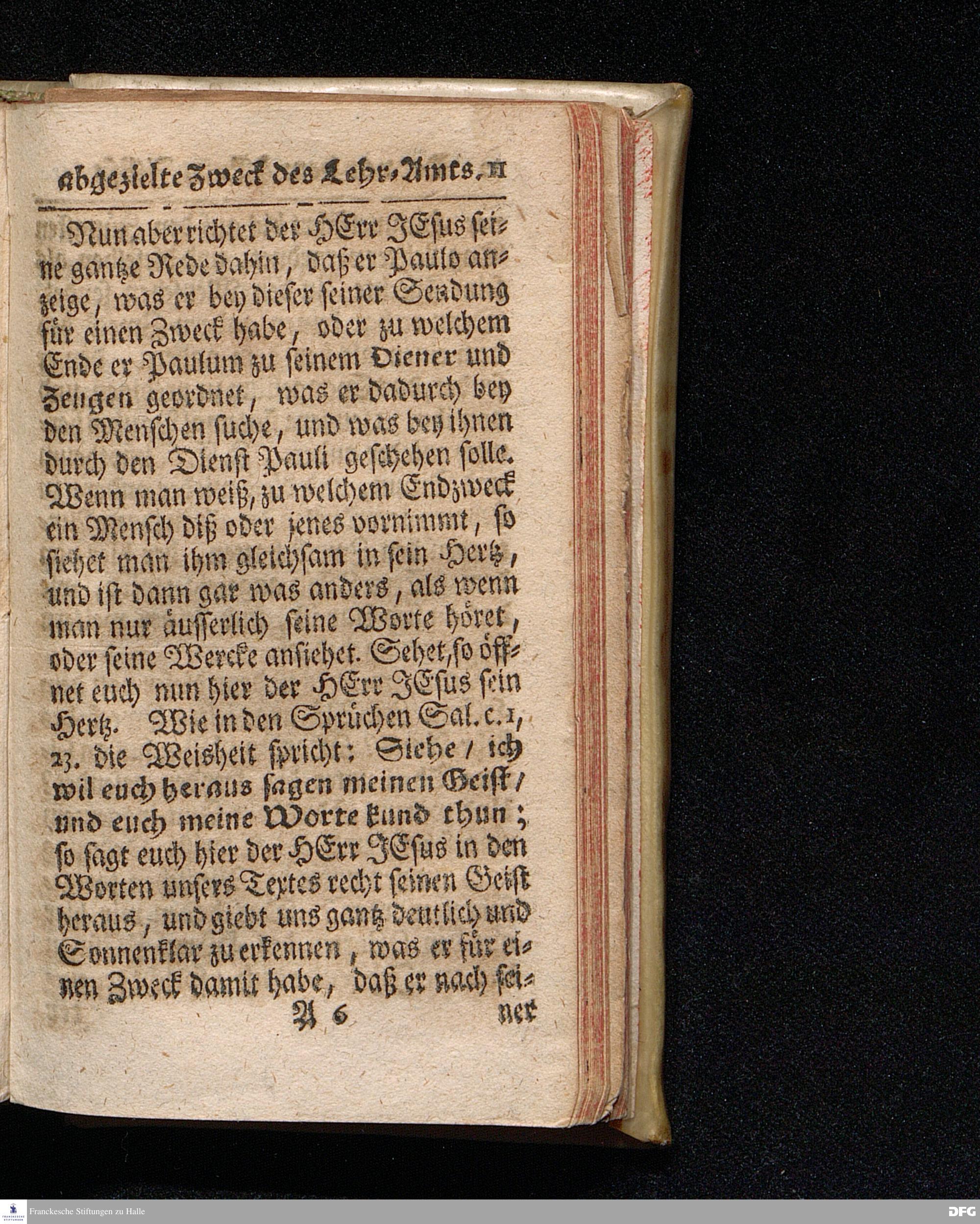 Der von dem HErrn JEsu Abgezielte Zweck des Lehr=Amts / Oder, Warum der HErr JEsus seine Knechte zu den Menschen sendet / und ihnen dieselben zu Lehrern verordnet, Aus der Apostel Gesch. 26 / 17.18. [Bibelzitat.] Am I.Buß=Tage den 3.Mart.1717. In der St.Ulrichs Kirche in Halle vorgestellet von August Hermann Francken / S.Th.Prof.& Past.zu St.Ulrich, und des Gymnasii Scholarcha, h.t. Acad.Pro-Rectore. Der Jugend in den Schulen des Wäysenhauses nach gehaltenem Examine den 8.Mai.gedachten Jahrs ausgetheilet. HALLE, in Verlegung des Wäysenhauses, 1717.