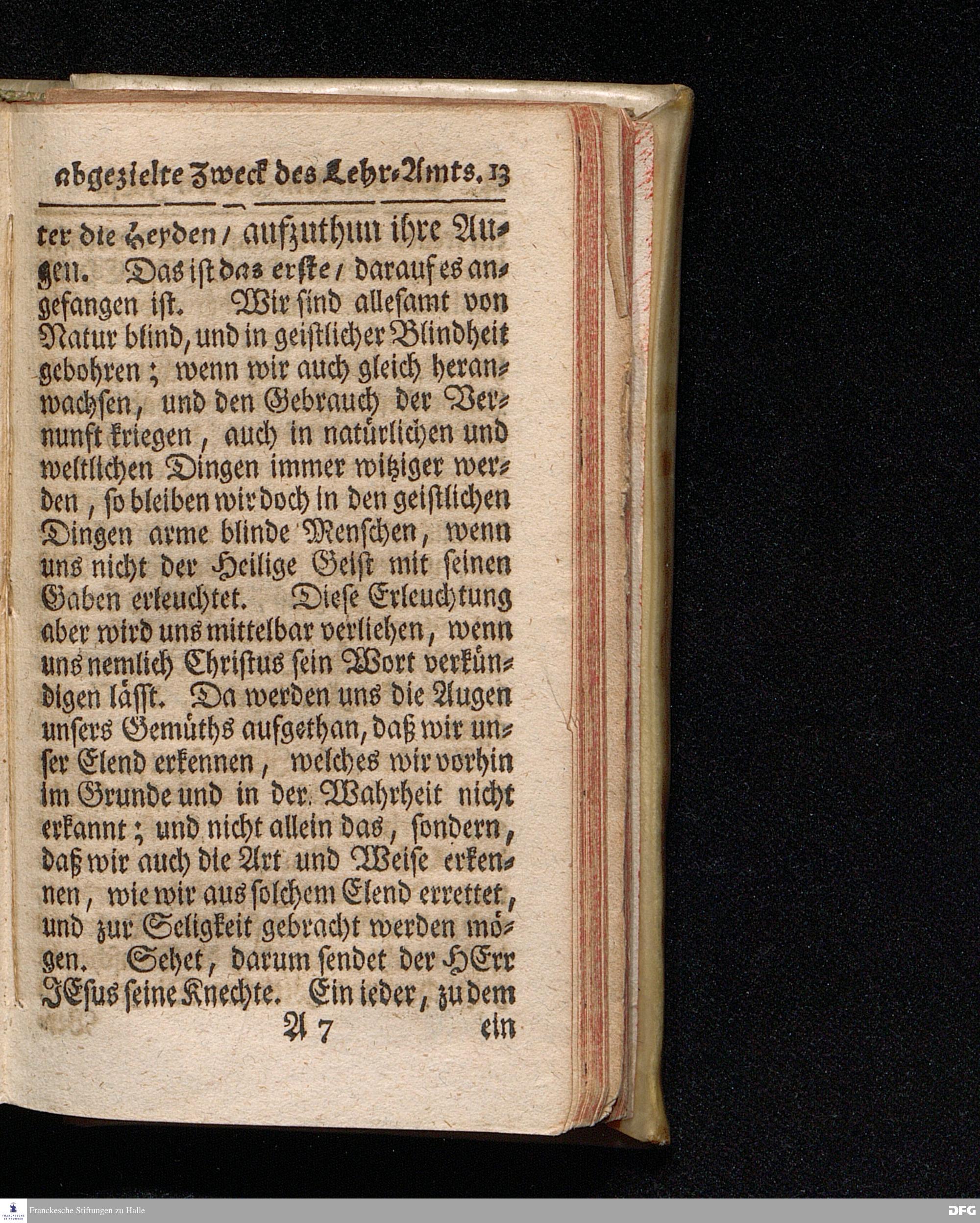 Der von dem HErrn JEsu Abgezielte Zweck des Lehr=Amts / Oder, Warum der HErr JEsus seine Knechte zu den Menschen sendet / und ihnen dieselben zu Lehrern verordnet, Aus der Apostel Gesch. 26 / 17.18. [Bibelzitat.] Am I.Buß=Tage den 3.Mart.1717. In der St.Ulrichs Kirche in Halle vorgestellet von August Hermann Francken / S.Th.Prof.& Past.zu St.Ulrich, und des Gymnasii Scholarcha, h.t. Acad.Pro-Rectore. Der Jugend in den Schulen des Wäysenhauses nach gehaltenem Examine den 8.Mai.gedachten Jahrs ausgetheilet. HALLE, in Verlegung des Wäysenhauses, 1717.