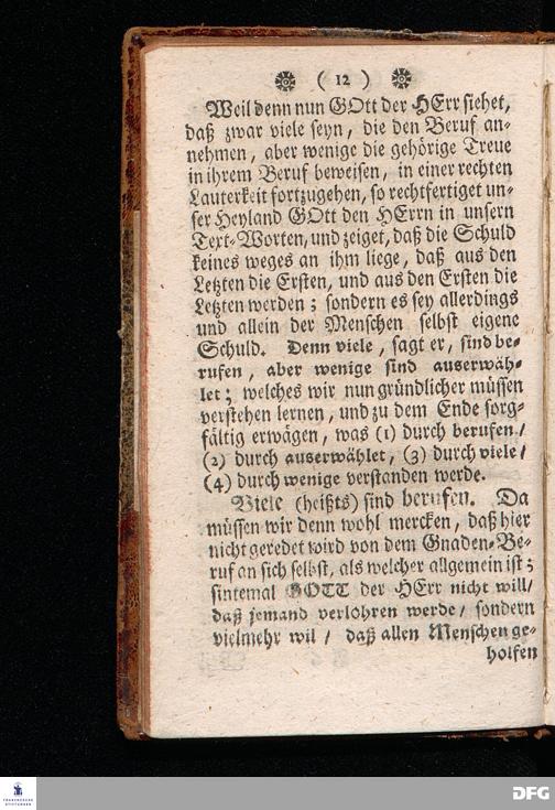 Erklärung des Spruchs Matth. 20 / 16. [Viele sind berufen / aber wenig sind auserwählet.] Auf dem Wäysen=Hause zu Glaucha An Halle Den 8.Jul.1711. ertheilet Von August Hermann Francken / S.Th.P.Ord.& Past.Glauch. Dritte Auflage. HALLE, In Verlegung des Wäysen=Hauses. MDCCXXIII.