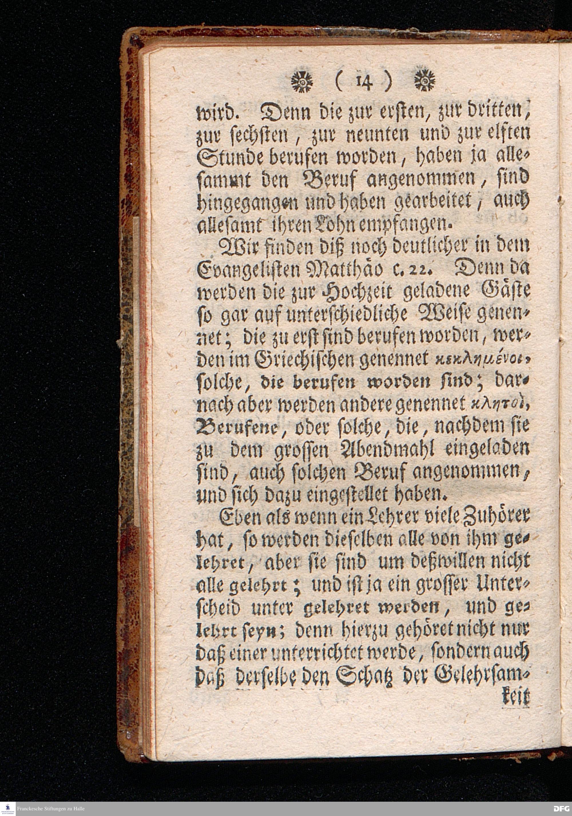 Erklärung des Spruchs Matth. 20 / 16. [Viele sind berufen / aber wenig sind auserwählet.] Auf dem Wäysen=Hause zu Glaucha An Halle Den 8.Jul.1711. ertheilet Von August Hermann Francken / S.Th.P.Ord.& Past.Glauch. Dritte Auflage. HALLE, In Verlegung des Wäysen=Hauses. MDCCXXIII.