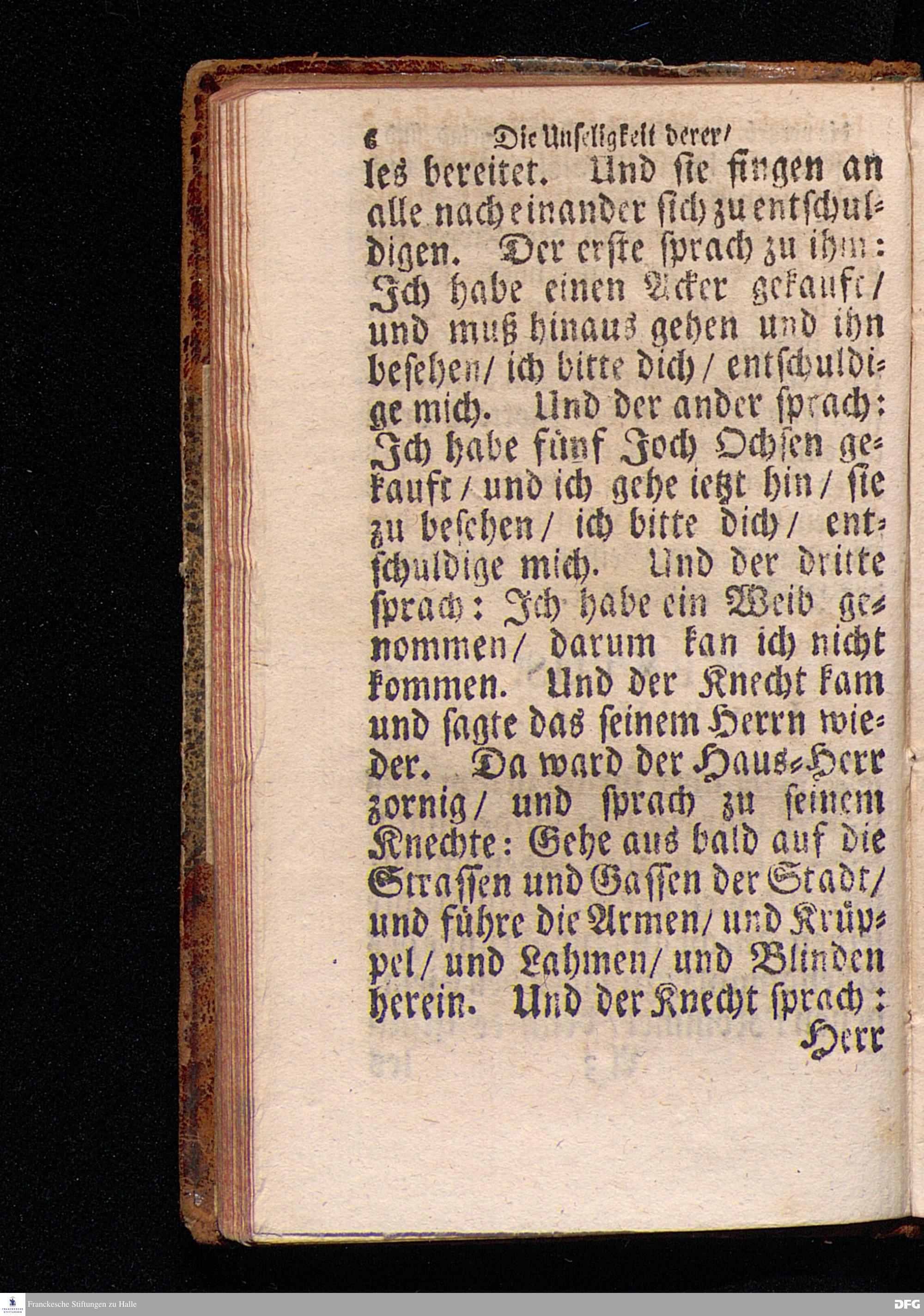 Die Unseligkeit Derer / Die vergebens zu dem Abendmahl GOttes geladen sind / Aus dem Evangelischen Text Luc.XIV, 16--24. Am II.Sonntag nach Trinit. 1715. In der S.Ulrichs=Kirche zu Halle vorgestellet von August Hermann Francken / S.Th.Prof.& Past.zu S.Ulrich und des Gymnasii Scholarcha. Der Jugend in denen zum Wäysenhause gehörigen Schulen nach gehaltenem Examine ausgetheilet d.8.Jul.1719. Andere Auflage. HALLE / In Verlegung des Wäysenhauses. 1729.