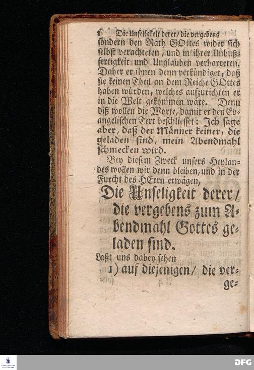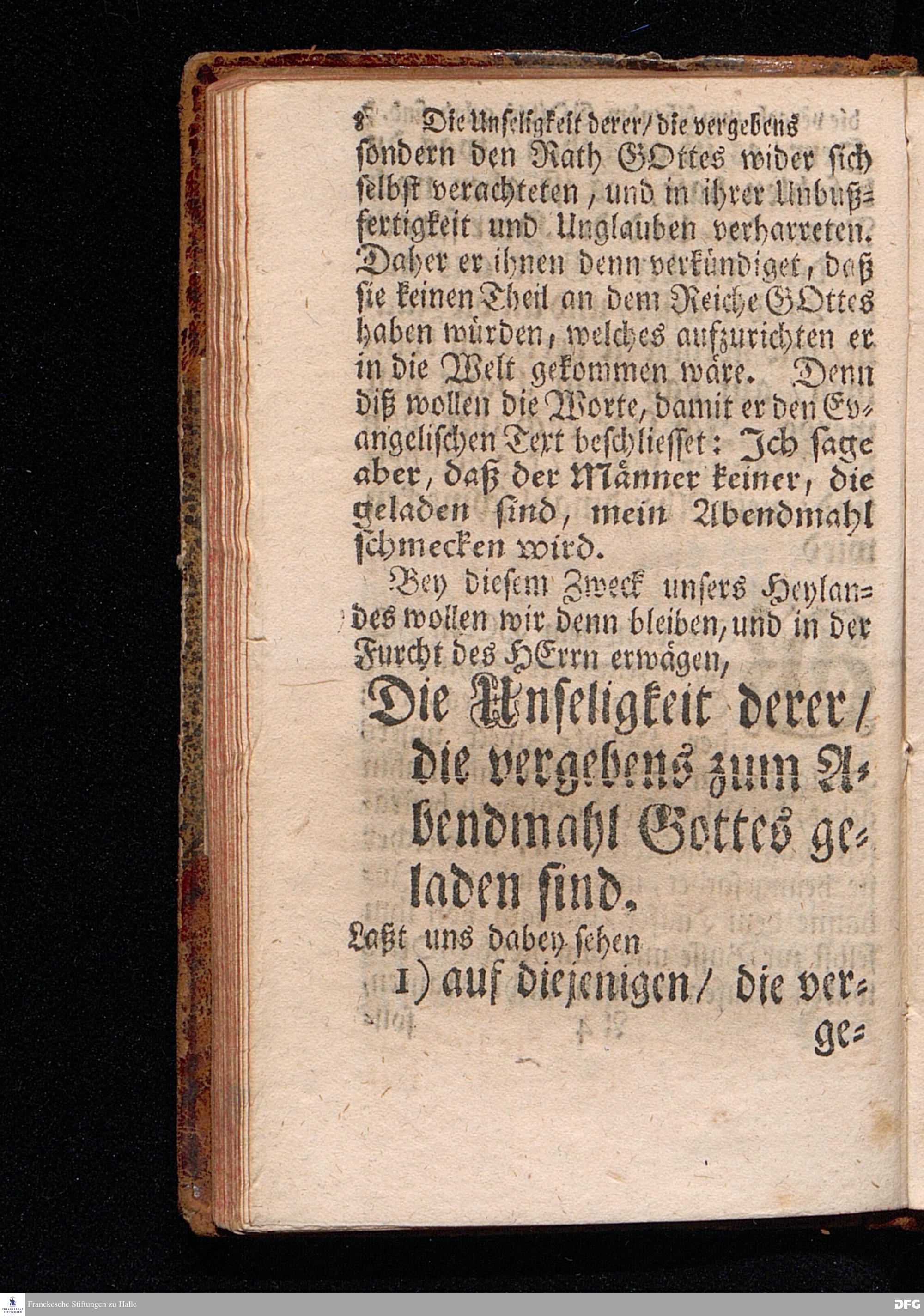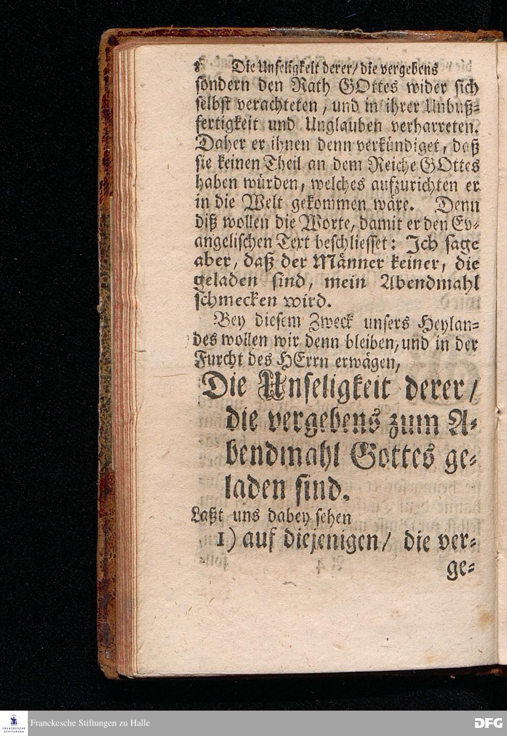 Die Unseligkeit Derer / Die vergebens zu dem Abendmahl GOttes geladen sind / Aus dem Evangelischen Text Luc.XIV, 16--24. Am II.Sonntag nach Trinit. 1715. In der S.Ulrichs=Kirche zu Halle vorgestellet von August Hermann Francken / S.Th.Prof.& Past.zu S.Ulrich und des Gymnasii Scholarcha. Der Jugend in denen zum Wäysenhause gehörigen Schulen nach gehaltenem Examine ausgetheilet d.8.Jul.1719. Andere Auflage. HALLE / In Verlegung des Wäysenhauses. 1729.