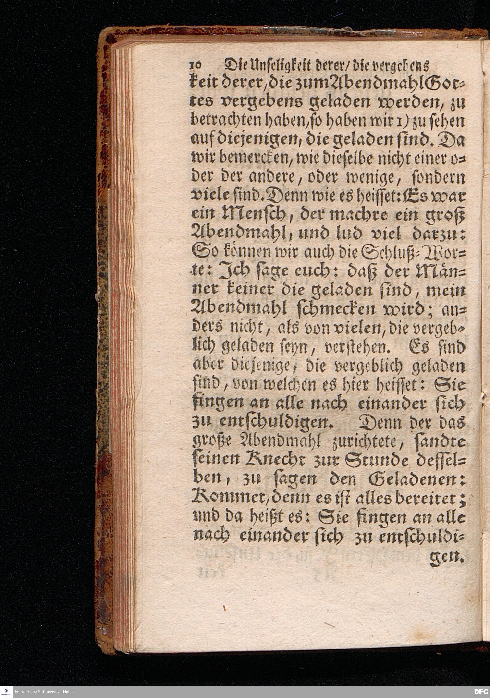 Die Unseligkeit Derer / Die vergebens zu dem Abendmahl GOttes geladen sind / Aus dem Evangelischen Text Luc.XIV, 16--24. Am II.Sonntag nach Trinit. 1715. In der S.Ulrichs=Kirche zu Halle vorgestellet von August Hermann Francken / S.Th.Prof.& Past.zu S.Ulrich und des Gymnasii Scholarcha. Der Jugend in denen zum Wäysenhause gehörigen Schulen nach gehaltenem Examine ausgetheilet d.8.Jul.1719. Andere Auflage. HALLE / In Verlegung des Wäysenhauses. 1729.