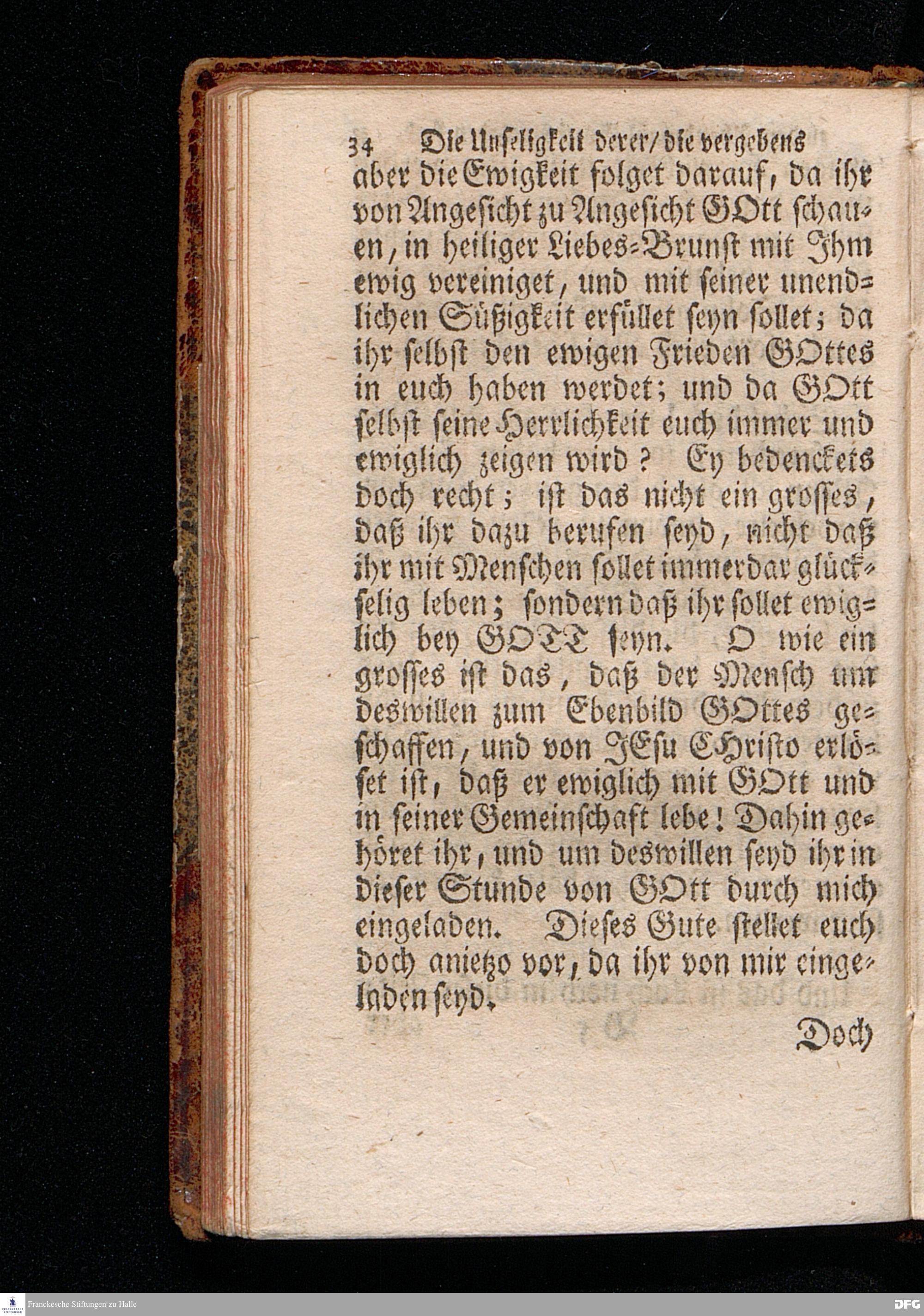 Die Unseligkeit Derer / Die vergebens zu dem Abendmahl GOttes geladen sind / Aus dem Evangelischen Text Luc.XIV, 16--24. Am II.Sonntag nach Trinit. 1715. In der S.Ulrichs=Kirche zu Halle vorgestellet von August Hermann Francken / S.Th.Prof.& Past.zu S.Ulrich und des Gymnasii Scholarcha. Der Jugend in denen zum Wäysenhause gehörigen Schulen nach gehaltenem Examine ausgetheilet d.8.Jul.1719. Andere Auflage. HALLE / In Verlegung des Wäysenhauses. 1729.