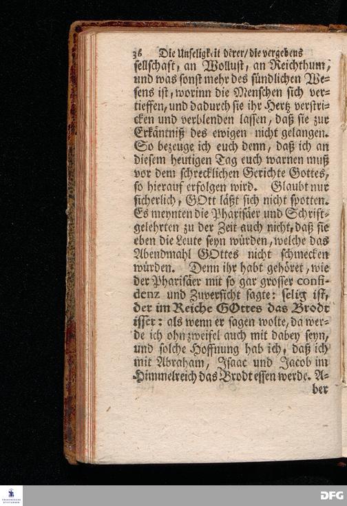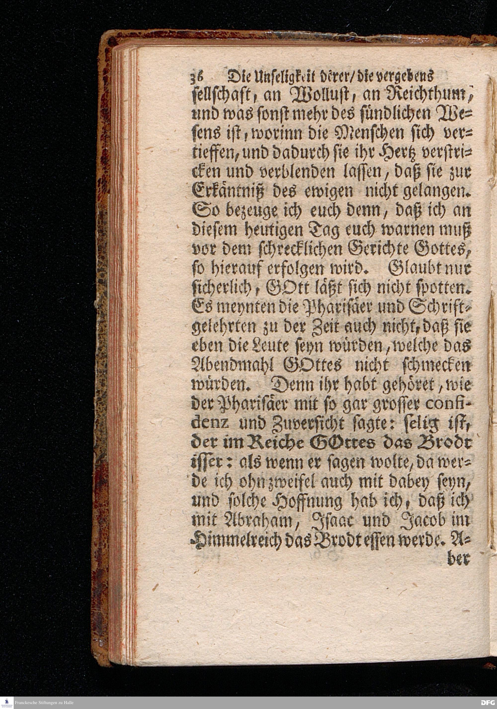 Die Unseligkeit Derer / Die vergebens zu dem Abendmahl GOttes geladen sind / Aus dem Evangelischen Text Luc.XIV, 16--24. Am II.Sonntag nach Trinit. 1715. In der S.Ulrichs=Kirche zu Halle vorgestellet von August Hermann Francken / S.Th.Prof.& Past.zu S.Ulrich und des Gymnasii Scholarcha. Der Jugend in denen zum Wäysenhause gehörigen Schulen nach gehaltenem Examine ausgetheilet d.8.Jul.1719. Andere Auflage. HALLE / In Verlegung des Wäysenhauses. 1729.