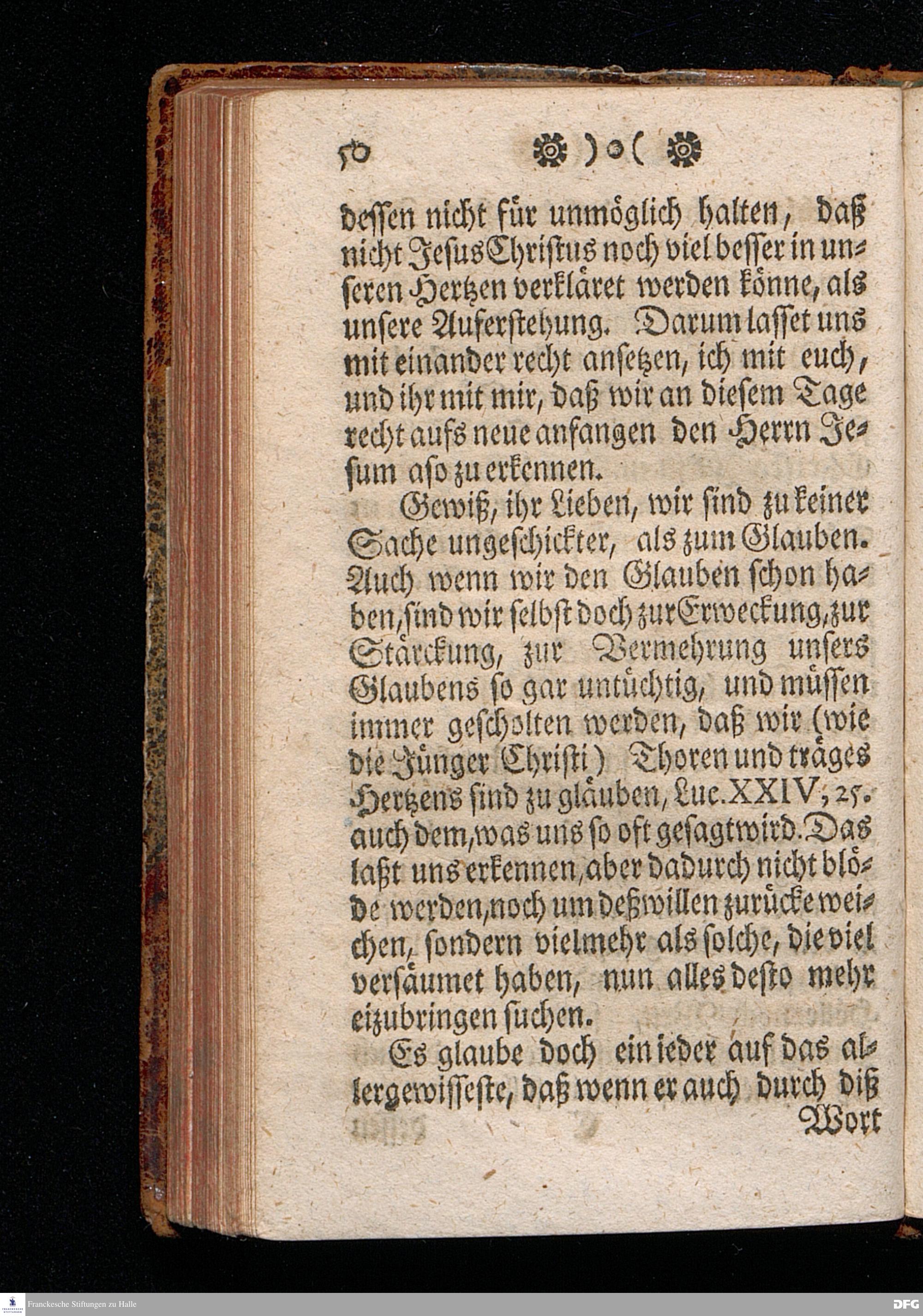 Vorbereitung auf das Heilige Oster=Fest / den 29.Mart. 1720. Nach Anleitung der Worte Joh.XI, 25.26. [Bibelzitat.] In Volckreicher Versammlung auf dem Wäysenhause Zu Glaucha an Halle gegeben von August Hermann Francken / S.Th.Pr.Past.Vlr.& Schol. Andere Auflage. Halle, zu finden im Wäysenhause. 1730.