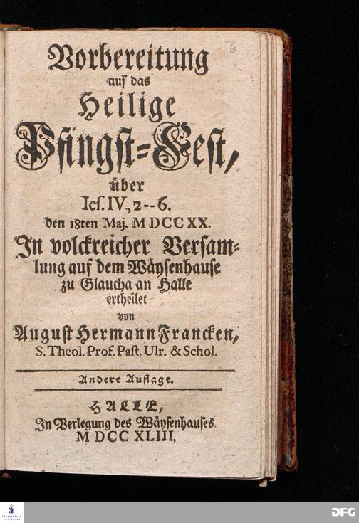 Vorbereitung auf das Heilige Pfingst=Fest, über Ies.IV, 2--6. den 18ten Maj. MDCCXX. In volckreicher Versamlung[!] auf dem Wäysenhause zu Glaucha an Halle ertheilet von August Hermann Francken, S.Theol.Prof.Past.Ulr.& Schol. Andere Auflage. HALLE, In Verlegung des Wäysenhauses. MDCCXLIII.