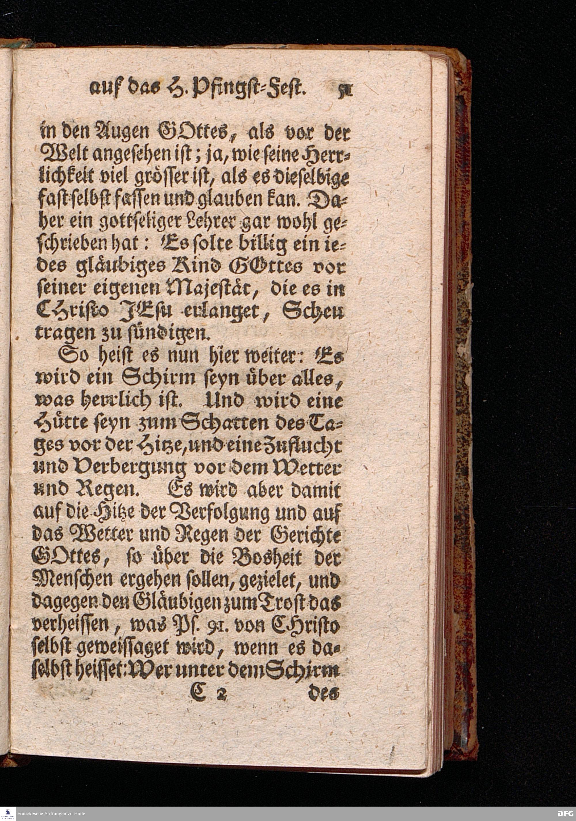 Vorbereitung auf das Heilige Pfingst=Fest, über Ies.IV, 2--6. den 18ten Maj. MDCCXX. In volckreicher Versamlung[!] auf dem Wäysenhause zu Glaucha an Halle ertheilet von August Hermann Francken, S.Theol.Prof.Past.Ulr.& Schol. Andere Auflage. HALLE, In Verlegung des Wäysenhauses. MDCCXLIII.