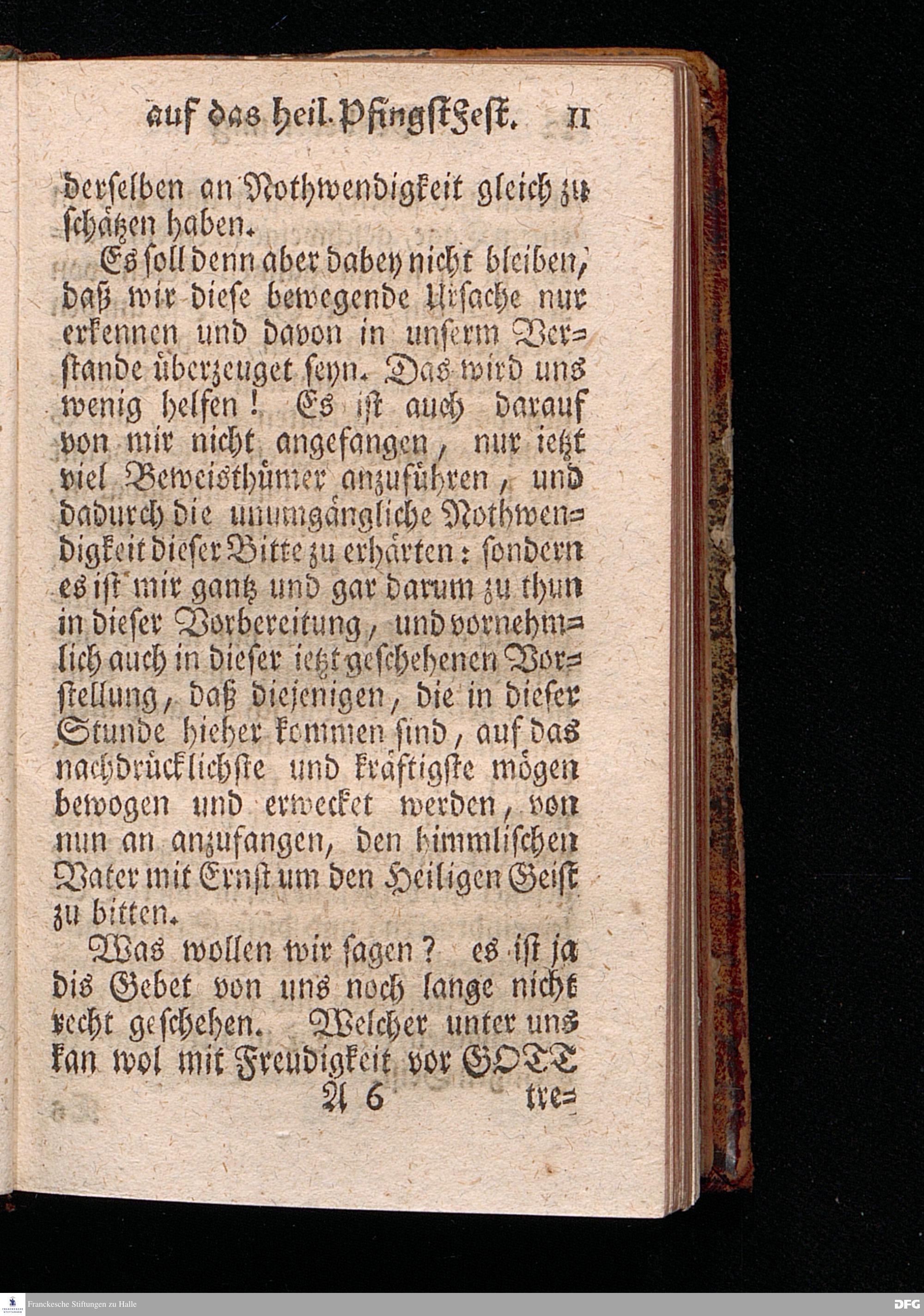 Vorbereitung auf das Heilige Pfingst=Fest / Den 26ten Maji 1719. nach Anleitung der Worte Luc.XI, 13. [Bibelzitat.] in Volckreicher Versammlung Auf dem Wäysen=Hause zu Glaucha an Halle gegeben von August Hermann Francken / SS.Theol.Prof.Past.Vlr.& Scholarcha. Die II.Auflage. HALLE, In Verlegung des Wäysen=Hauses. 1730.