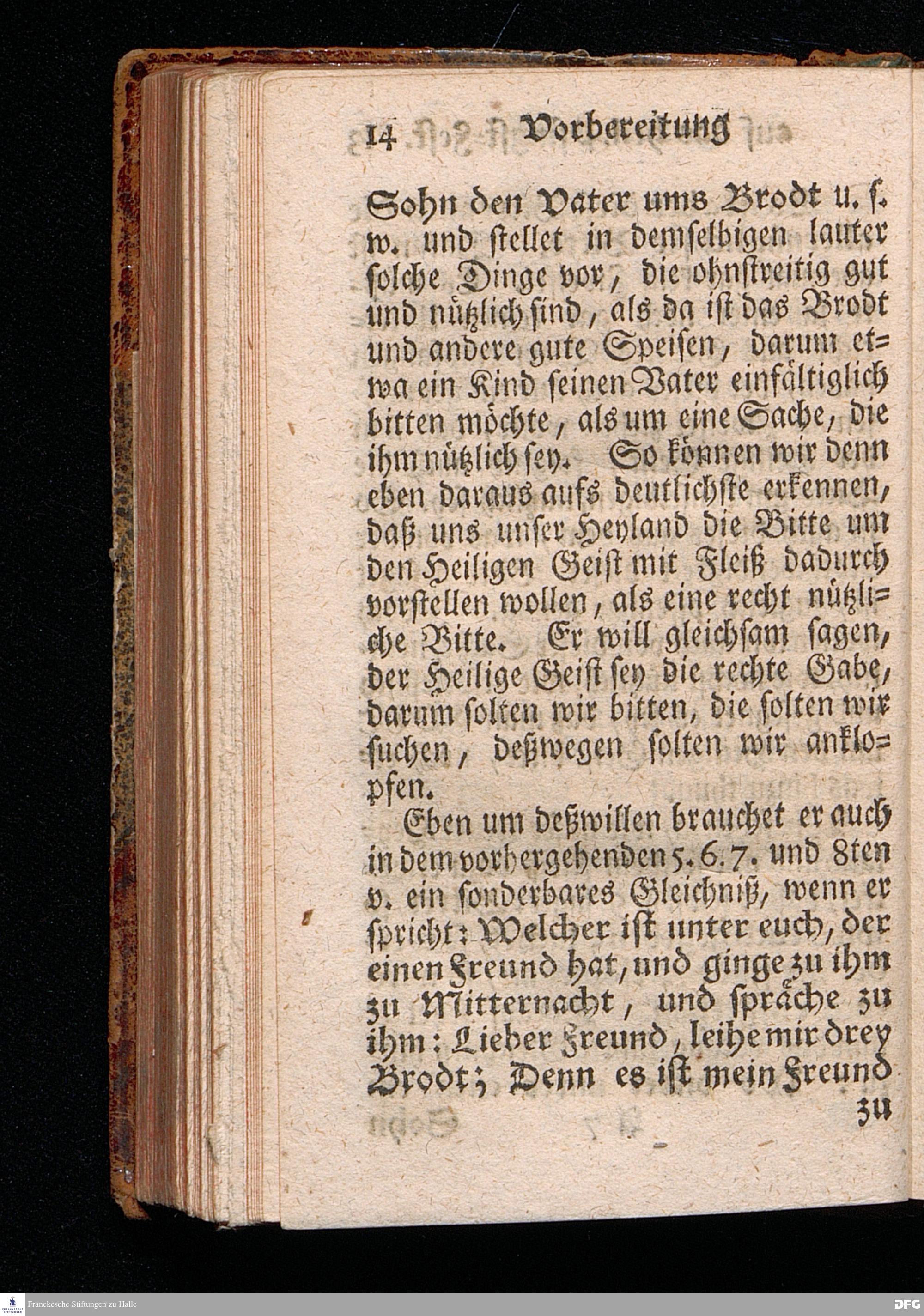 Vorbereitung auf das Heilige Pfingst=Fest / Den 26ten Maji 1719. nach Anleitung der Worte Luc.XI, 13. [Bibelzitat.] in Volckreicher Versammlung Auf dem Wäysen=Hause zu Glaucha an Halle gegeben von August Hermann Francken / SS.Theol.Prof.Past.Vlr.& Scholarcha. Die II.Auflage. HALLE, In Verlegung des Wäysen=Hauses. 1730.