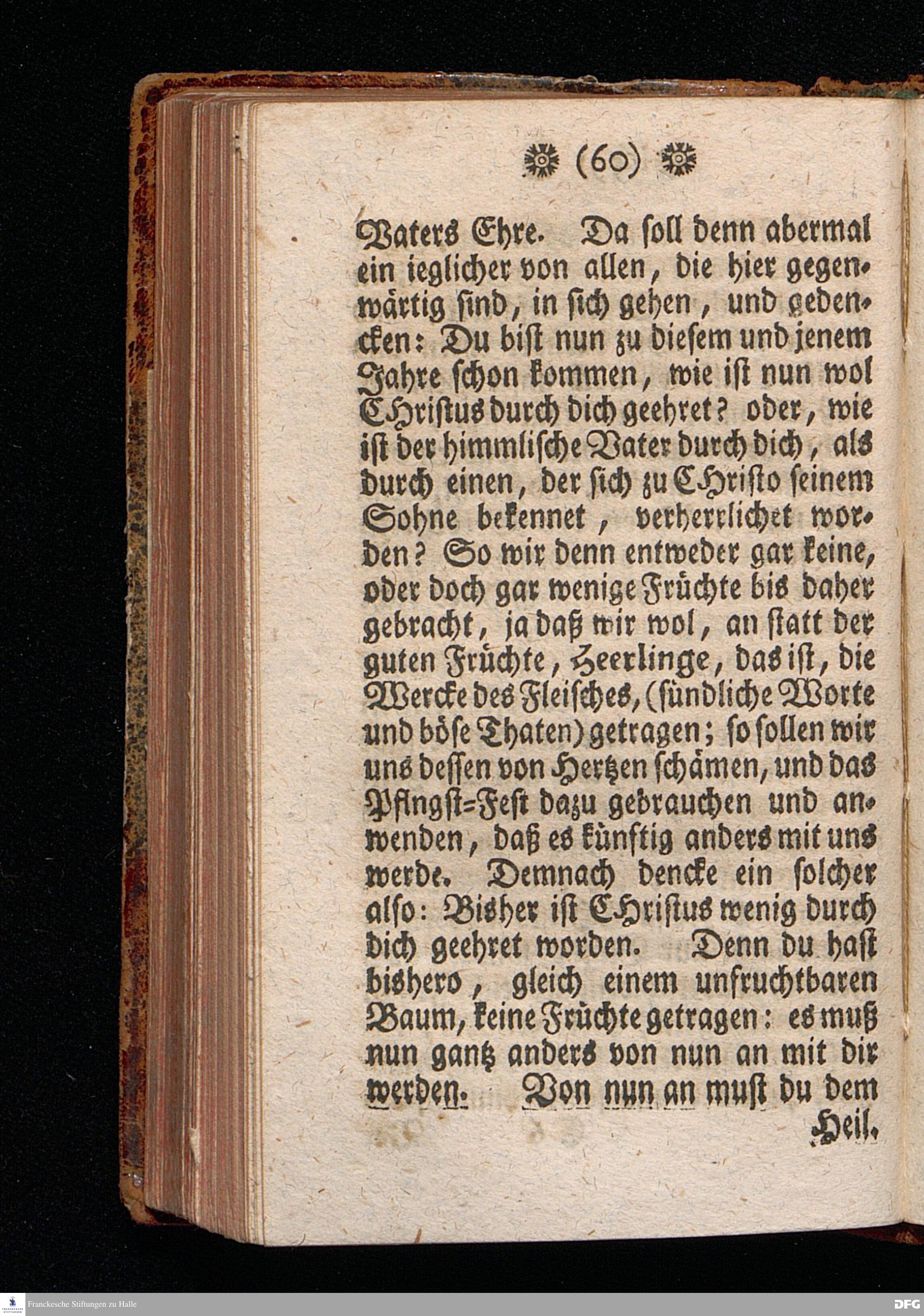 Vorbereitung auf das Heilige Pfingst=Fest, nach Anleitung Der Worte Pauli 1.Cor.XII,3. [Bibelzitat.] in öffentlicher Versammlung auf dem Wäysen=Hause zu Glaucha an Halle, den 7.Jun.1710. ertheilet Von August Hermann Francken, S.Theol.Prof.Ord.und Past.zu St.Ulrich, und des Gymnasii Scholarcha. Dritte Auflage. HALLE, in Verlegung des Wäysen=Hauses, 1741.
