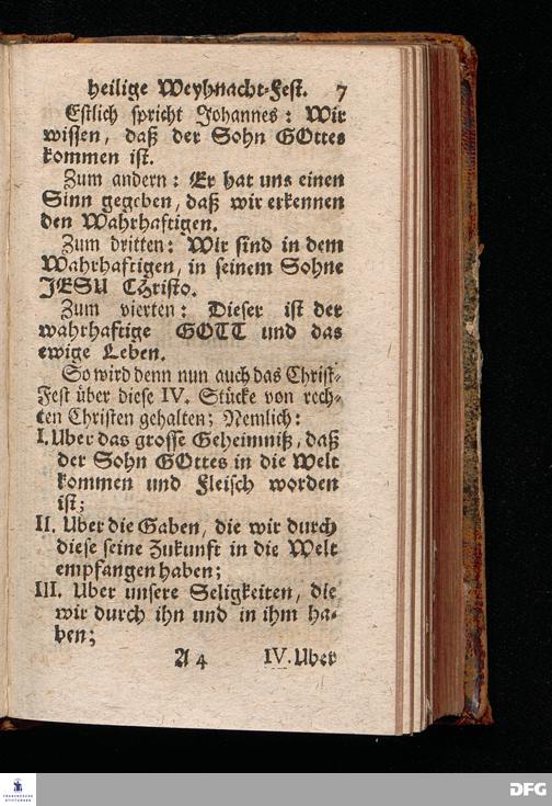 Vorbereitung auf das Weyhnacht=Fest / über die Worte 1 Joh.V, 20. [Bibelzitat;] den 22.Decembr. 1719. in Volckreicher Versammlung auf dem Wäysen=Hause zu Glaucha an Halle ertheilet von August Hermann Francken, S.Theol.Prof.Past. zu St.Ulrich, und des Gymnasii Scholarcha. Der Jugend in den Schulen des Wäysen=Hauses nach gehaltenem Examine ausgetheilet den 14.Decembr.1720. HALLE, gedr.im Wäysen=Hause. 1729.