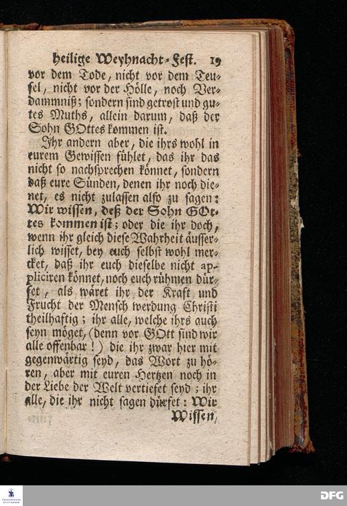 Vorbereitung auf das Weyhnacht=Fest / über die Worte 1 Joh.V, 20. [Bibelzitat;] den 22.Decembr. 1719. in Volckreicher Versammlung auf dem Wäysen=Hause zu Glaucha an Halle ertheilet von August Hermann Francken, S.Theol.Prof.Past. zu St.Ulrich, und des Gymnasii Scholarcha. Der Jugend in den Schulen des Wäysen=Hauses nach gehaltenem Examine ausgetheilet den 14.Decembr.1720. HALLE, gedr.im Wäysen=Hause. 1729.
