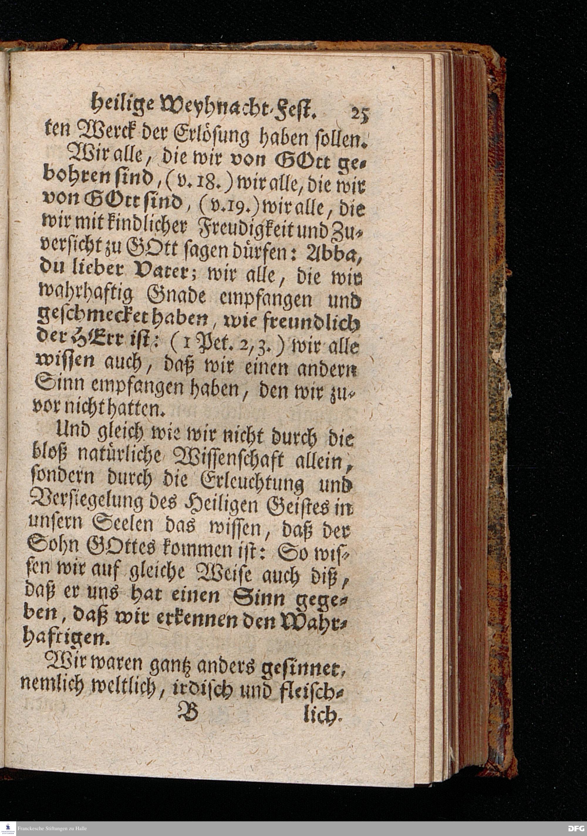 Vorbereitung auf das Weyhnacht=Fest / über die Worte 1 Joh.V, 20. [Bibelzitat;] den 22.Decembr. 1719. in Volckreicher Versammlung auf dem Wäysen=Hause zu Glaucha an Halle ertheilet von August Hermann Francken, S.Theol.Prof.Past. zu St.Ulrich, und des Gymnasii Scholarcha. Der Jugend in den Schulen des Wäysen=Hauses nach gehaltenem Examine ausgetheilet den 14.Decembr.1720. HALLE, gedr.im Wäysen=Hause. 1729.