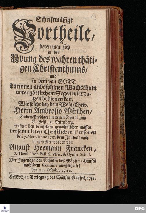 Schriftmäßige Vortheile, deren man sich in der Ubung des wahren thätigen Christenthums / und in dem von GOTT darinnen anbefohlnen Wachsthum unter göttlichem Segen mit Nutzen bedienen kan, Wie solche bey dem Wohl=Ehrw. Herrn Ambrosio Wirthen / Suden=Prediger im neuen Spital zum H.Geist, zu Nürnberg, einigen bey demselben gewöhnlicher massen versammleten Christlichen Personen den 7.Mart. Anno 1718. dem Innhalt nach vorgestellet worden von August Hermann Francken, S.Theol.Prof.Past.S.Vlric.& Gymn.Schol. Der Jugend in den Schulen des Wäysen=Hauses nach dem Examine ausgetheilet den 24.Octobr.1722. HALLE, in Verlegung des Wäysen=Hauses, 1734.