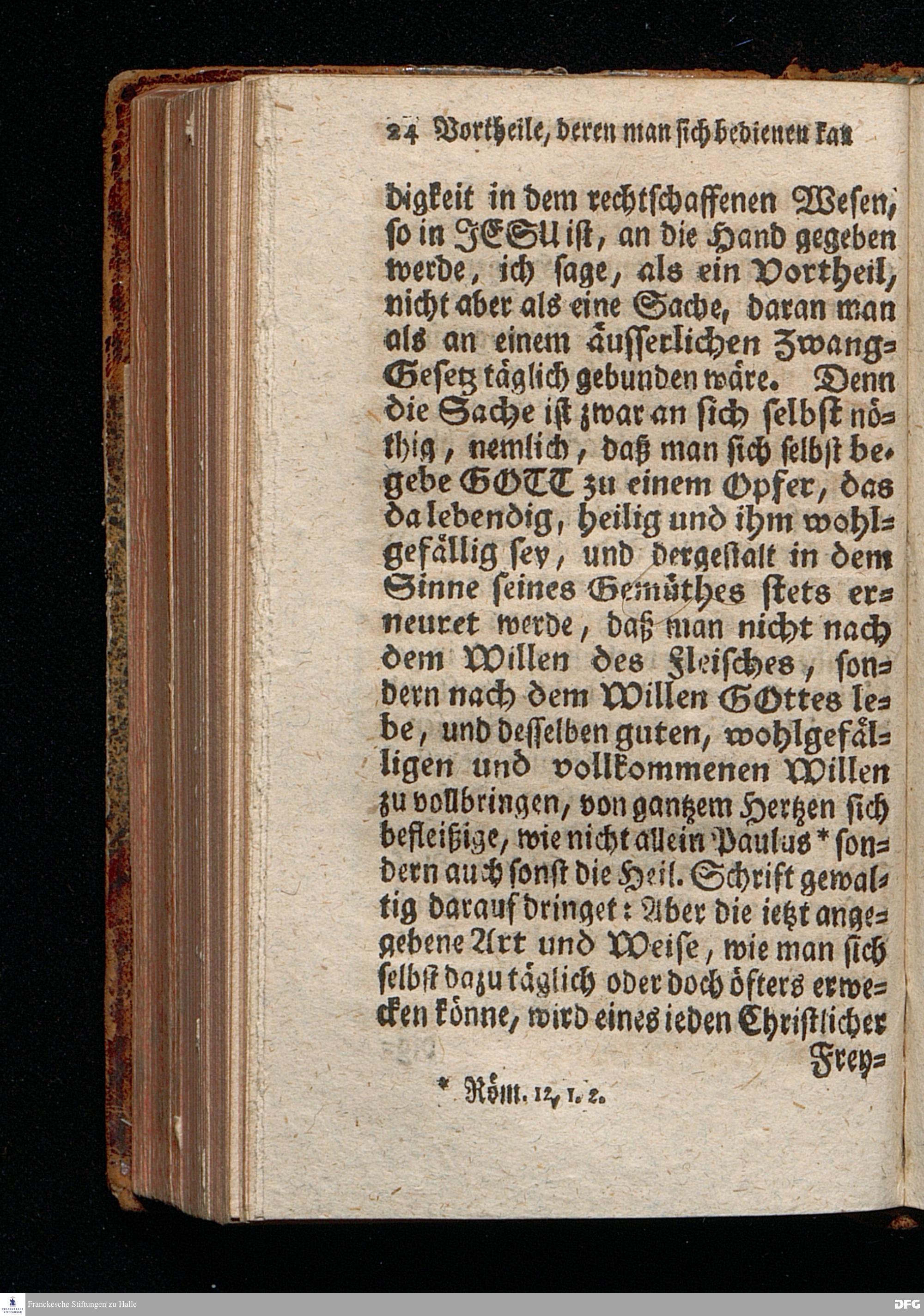 Schriftmäßige Vortheile, deren man sich in der Ubung des wahren thätigen Christenthums / und in dem von GOTT darinnen anbefohlnen Wachsthum unter göttlichem Segen mit Nutzen bedienen kan, Wie solche bey dem Wohl=Ehrw. Herrn Ambrosio Wirthen / Suden=Prediger im neuen Spital zum H.Geist, zu Nürnberg, einigen bey demselben gewöhnlicher massen versammleten Christlichen Personen den 7.Mart. Anno 1718. dem Innhalt nach vorgestellet worden von August Hermann Francken, S.Theol.Prof.Past.S.Vlric.& Gymn.Schol. Der Jugend in den Schulen des Wäysen=Hauses nach dem Examine ausgetheilet den 24.Octobr.1722. HALLE, in Verlegung des Wäysen=Hauses, 1734.
