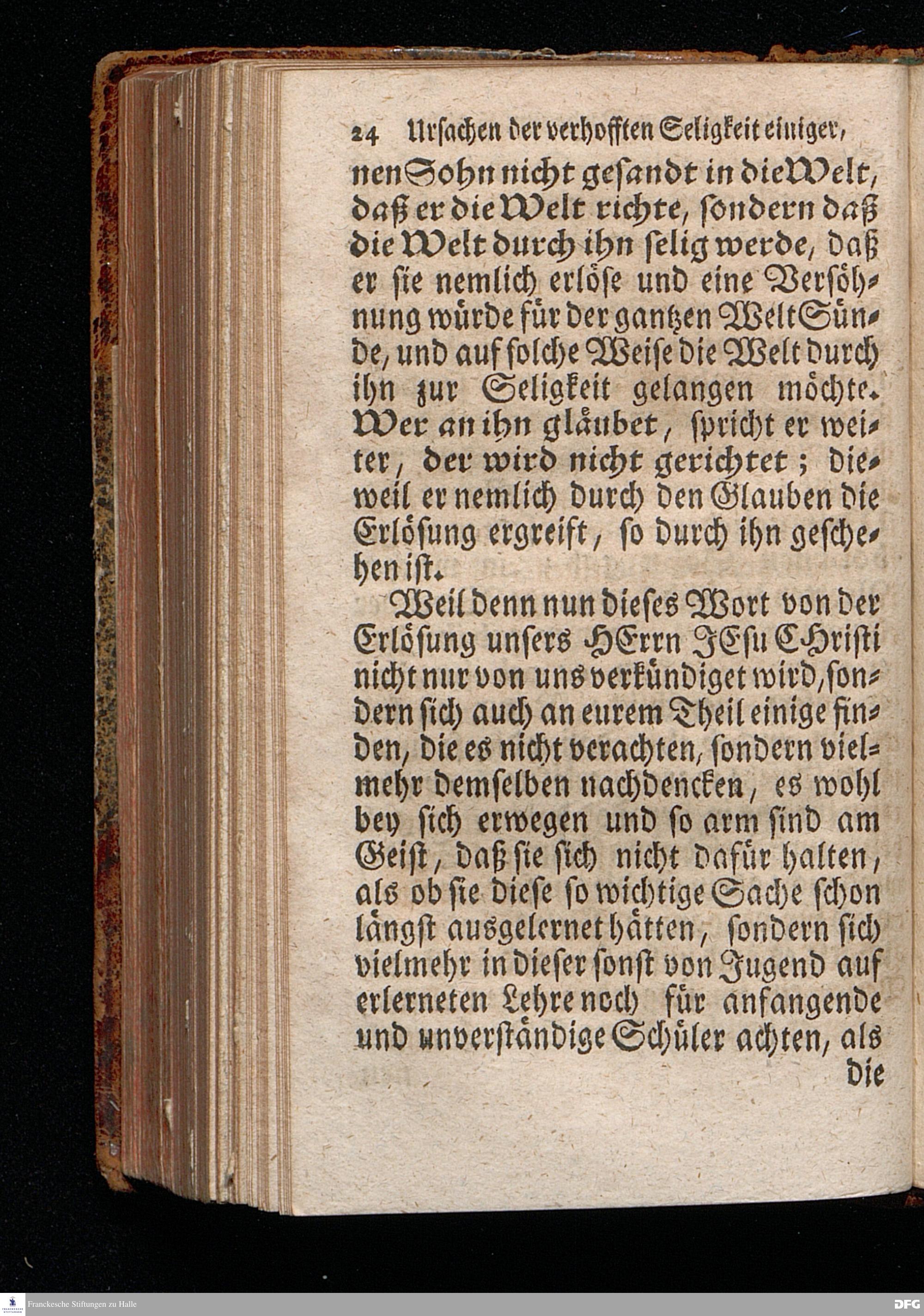 Die Ursachen der gehofften Seligkeit einiger, Und der besorgten Verdammniß vieler, Die sich äusserlich zur Christlichen Gemeine halten / Am andern Pfingst=Feyertage 1718. nach Anleitung des Evangel.Textes Joh.III, 16-21. In der S.Ulrichs=Kirche in Halle / mit stetiger Application auf die Zuhörer vorgestellet von August Hermann Francken / S.Th.Prof.& Past.zu S.Ulrich, und des Gymnasii Scholarcha. Andere Auflage. Der Jugend in den Schulen des Wäysenhauses, nach gehaltenem Examine, den 18.Jun. gedachten Jahrs, ausgetheilet. Halle, in Verlegung des Wäysenhauses. 1723.