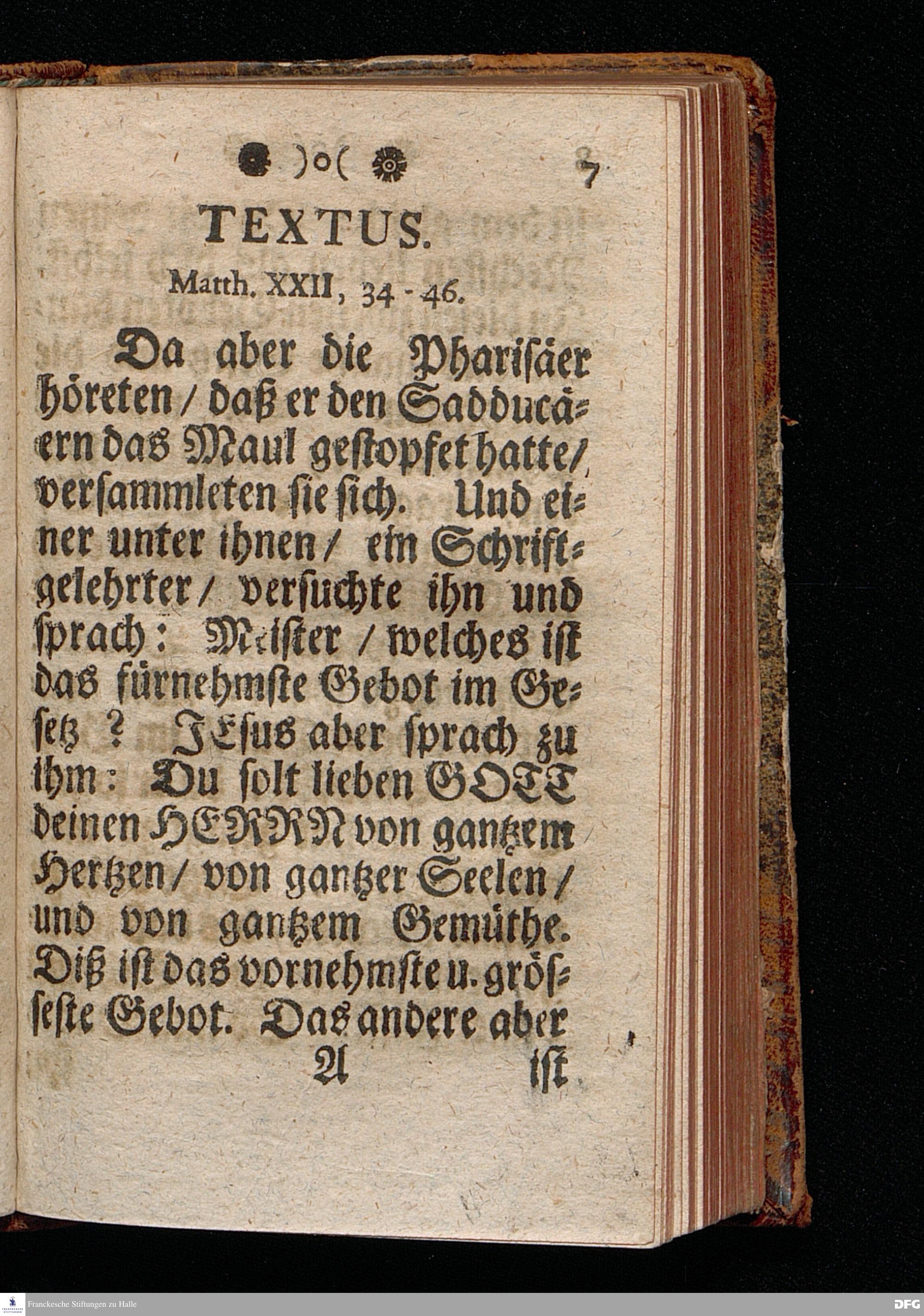 Der Wille Gottes nach dem Gesetz und nach dem Evangelio, Am 18.Sonntage nach Trinit. 1717. aus dem ordentlichen Evangelischen Text Matth.XX [vielm.XXII!], 34=46. in einer zu Hachenburg auf dem Westerwalde bey damaliger Reise auf der Hoch=Gräflichen Herrschaft Verlangen gehaltenen Predigt vorgestellet von August Hermann Francken / S.Th.Prof.Past.Ulric.& Gymn.Schol. Andere Auflage. HALLE, Gedruckt im Wäysen=Hause. 1738.
