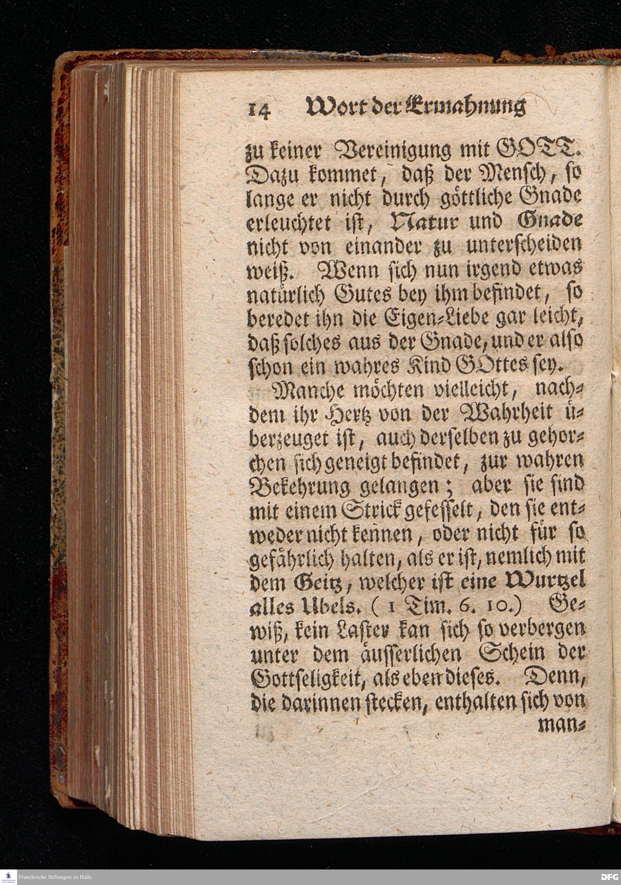 Ein Wort der Ermahnung und des Trostes, An Die in einer namhaften Stadt befindliche GOtt suchende und GOtt liebende, oder doch von der Warheit, die in Christo JEsuist[!], wenigstens einiger Massen, Uberzeugete Seelen, aus Christlichem Wohlmeynen, nach einigen Aufenthalt daselbst, abgelassen aus Halle den 7.Jan.1710. von August Hermann Francken. [Bibelzitat.] HALLE, In Verlegung des Wäysenhauses.