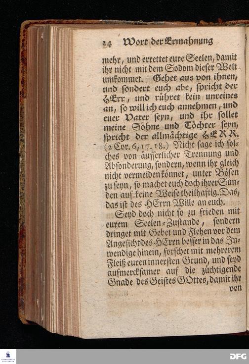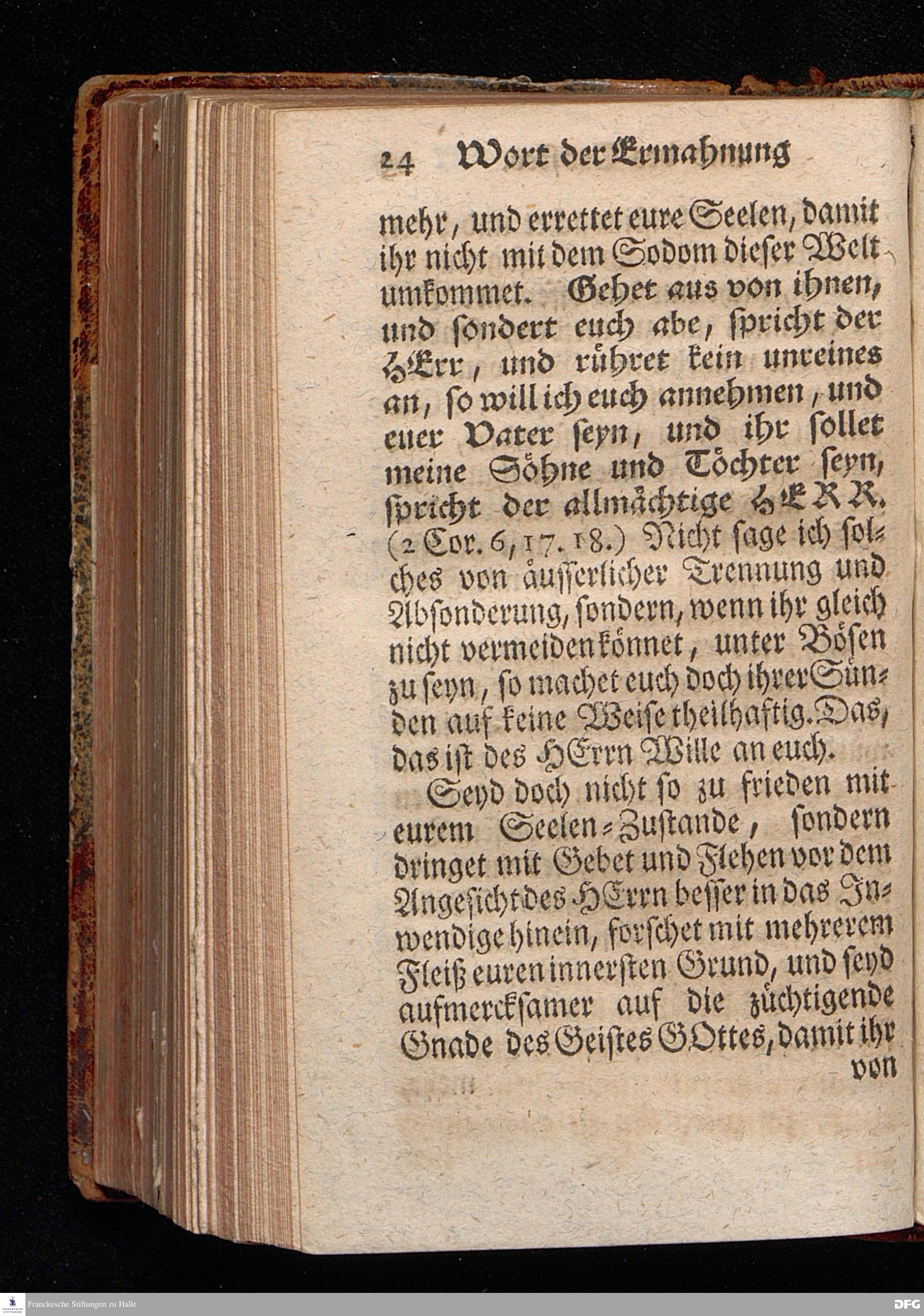 Ein Wort der Ermahnung und des Trostes, An Die in einer namhaften Stadt befindliche GOtt suchende und GOtt liebende, oder doch von der Warheit, die in Christo JEsuist[!], wenigstens einiger Massen, Uberzeugete Seelen, aus Christlichem Wohlmeynen, nach einigen Aufenthalt daselbst, abgelassen aus Halle den 7.Jan.1710. von August Hermann Francken. [Bibelzitat.] HALLE, In Verlegung des Wäysenhauses.