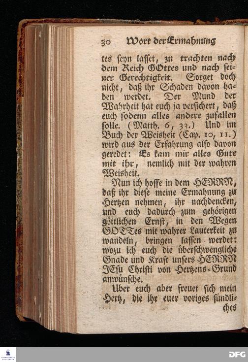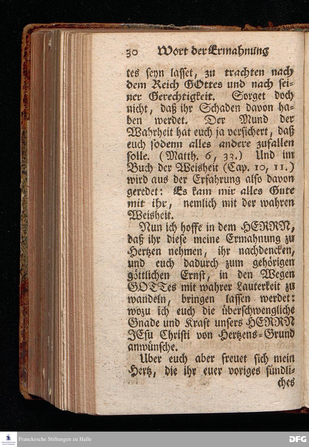 Ein Wort der Ermahnung und des Trostes, An Die in einer namhaften Stadt befindliche GOtt suchende und GOtt liebende, oder doch von der Warheit, die in Christo JEsuist[!], wenigstens einiger Massen, Uberzeugete Seelen, aus Christlichem Wohlmeynen, nach einigen Aufenthalt daselbst, abgelassen aus Halle den 7.Jan.1710. von August Hermann Francken. [Bibelzitat.] HALLE, In Verlegung des Wäysenhauses.