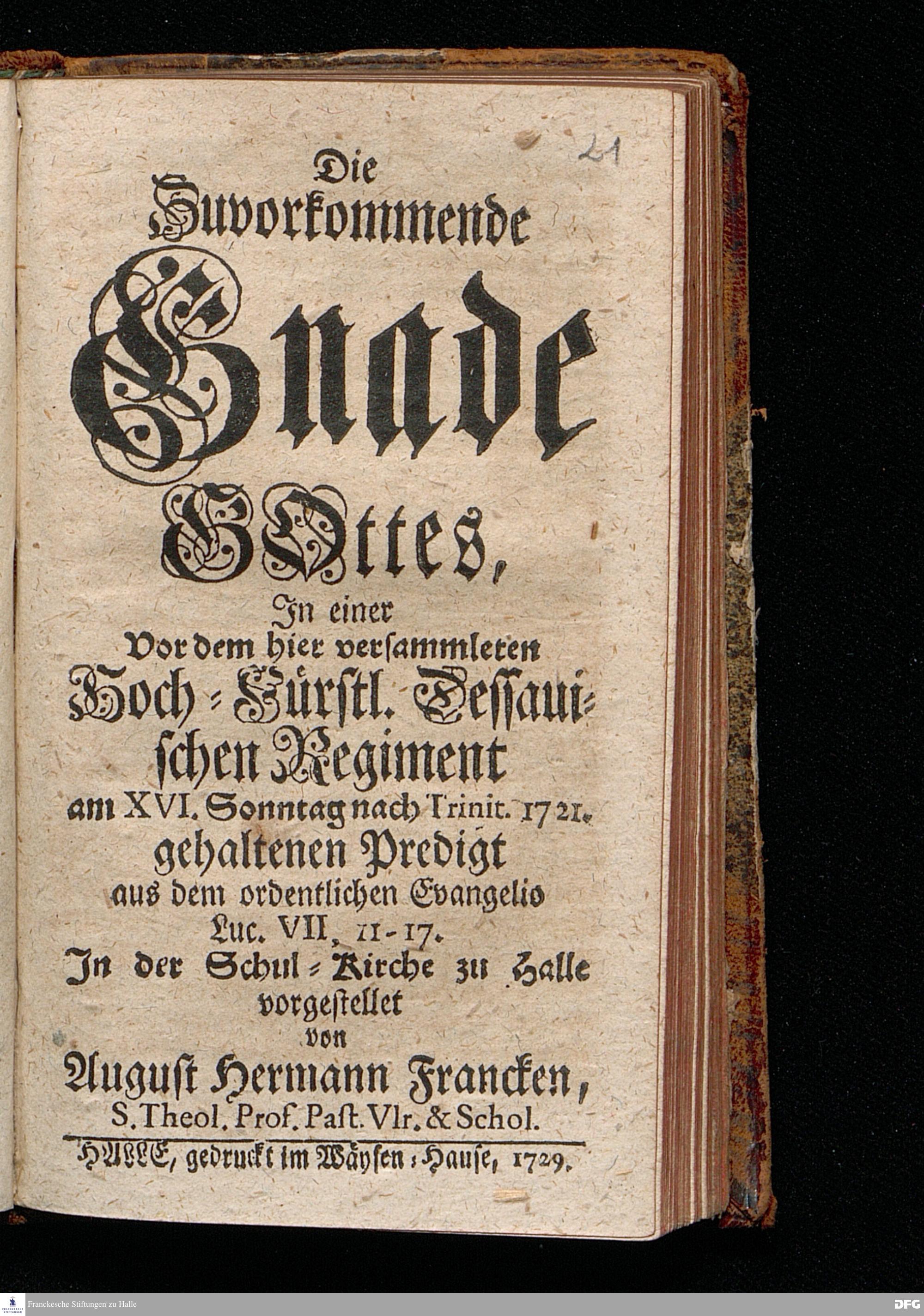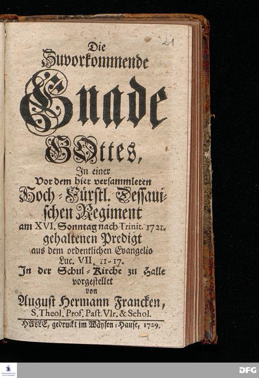 Die Zuvorkommende Gnade GOttes, In einer Vor dem hier versammleten Hoch=Fürstl.Dessauischen Regiment am XVI.Sonntag nach Trinit.1721. gehaltenen Predigt aus dem ordentlichen Evangelio Luc.VII, 11-17. In der Schul=Kirche zu Halle vorgestellet von August Hermann Francken, S.Theol.Prof.Past.Vlr.& Schol. HALLE, gedruckt im Wäysen=Hause, 1729.