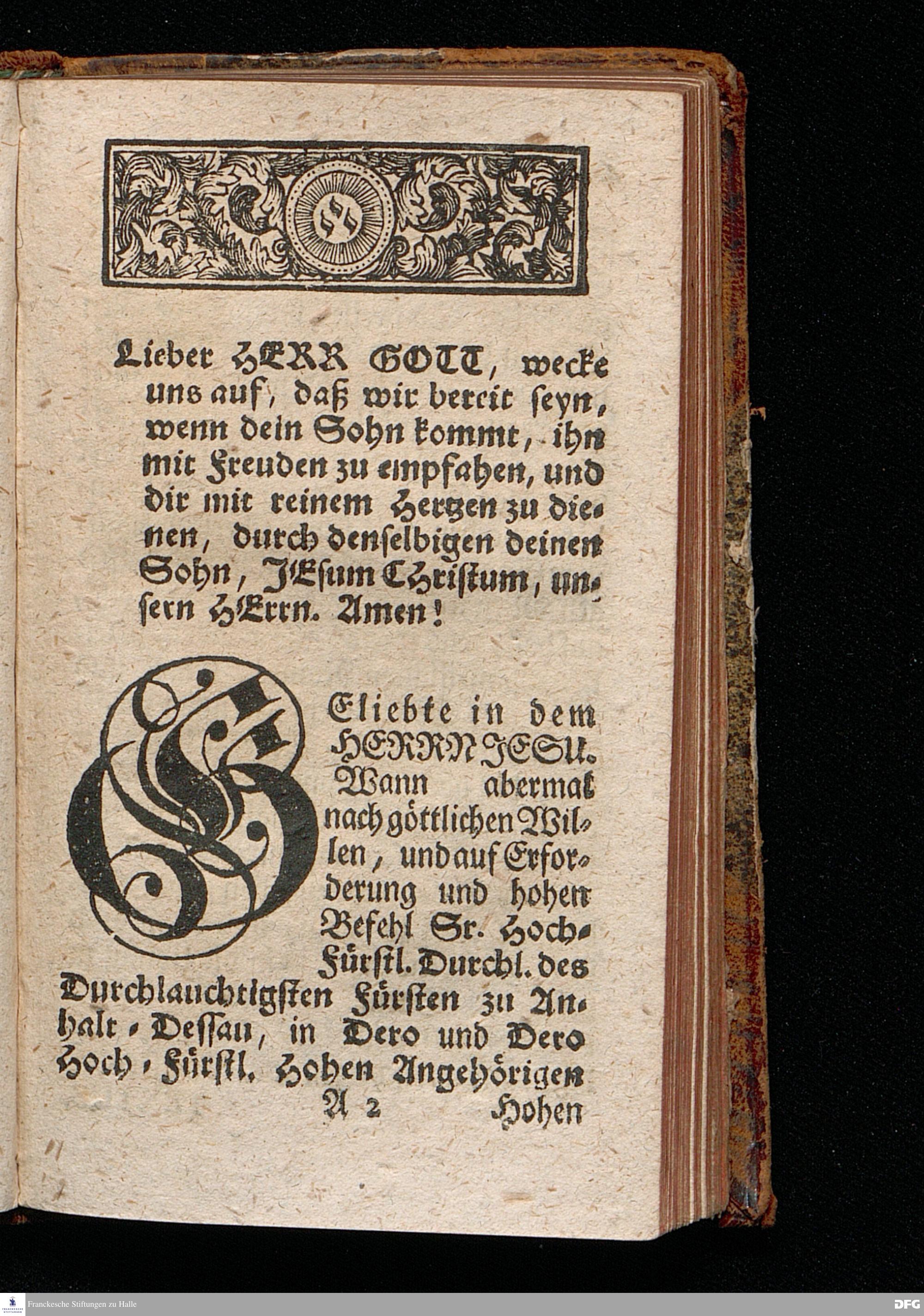 Die Zuvorkommende Gnade GOttes, In einer Vor dem hier versammleten Hoch=Fürstl.Dessauischen Regiment am XVI.Sonntag nach Trinit.1721. gehaltenen Predigt aus dem ordentlichen Evangelio Luc.VII, 11-17. In der Schul=Kirche zu Halle vorgestellet von August Hermann Francken, S.Theol.Prof.Past.Vlr.& Schol. HALLE, gedruckt im Wäysen=Hause, 1729.