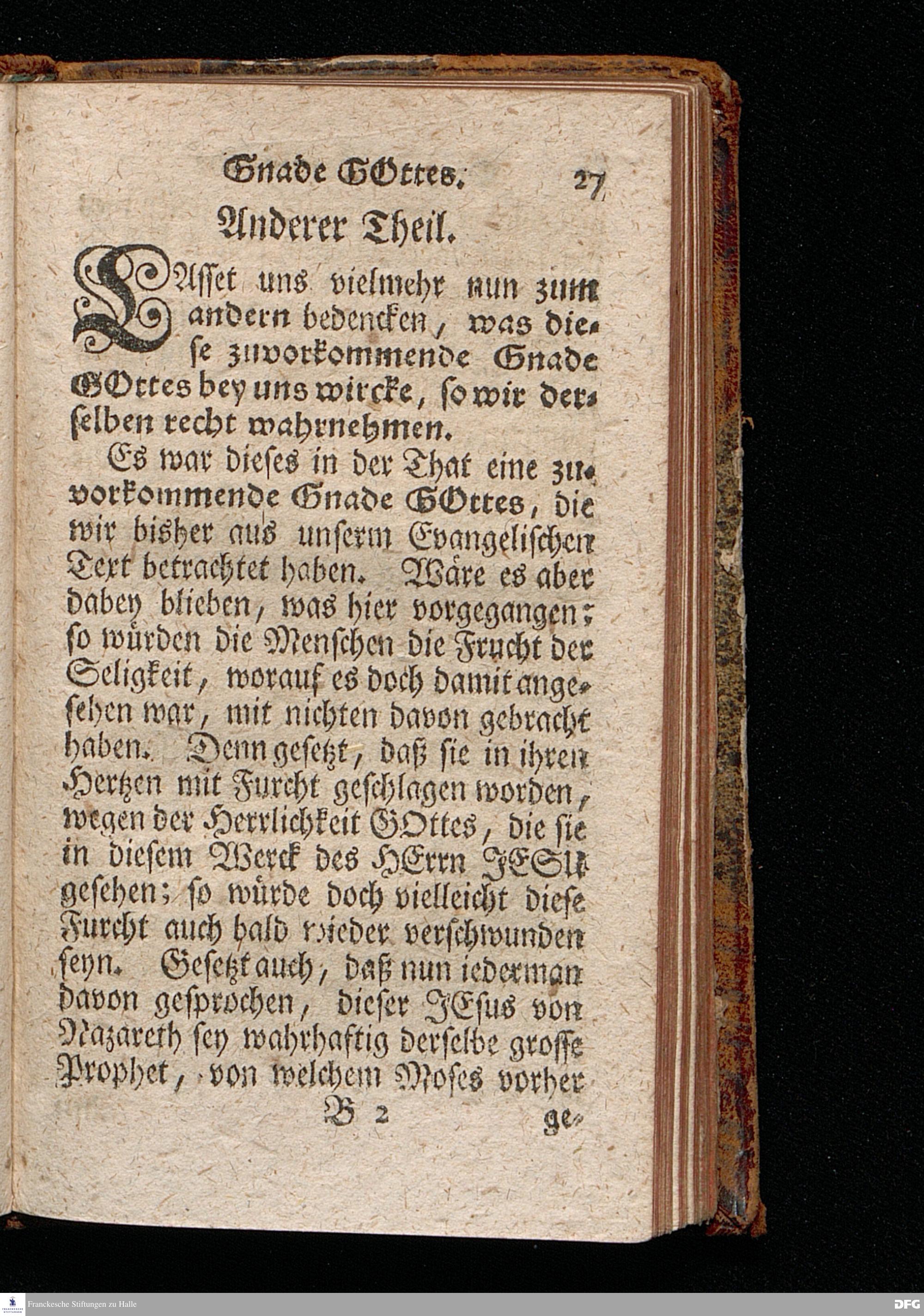 Die Zuvorkommende Gnade GOttes, In einer Vor dem hier versammleten Hoch=Fürstl.Dessauischen Regiment am XVI.Sonntag nach Trinit.1721. gehaltenen Predigt aus dem ordentlichen Evangelio Luc.VII, 11-17. In der Schul=Kirche zu Halle vorgestellet von August Hermann Francken, S.Theol.Prof.Past.Vlr.& Schol. HALLE, gedruckt im Wäysen=Hause, 1729.