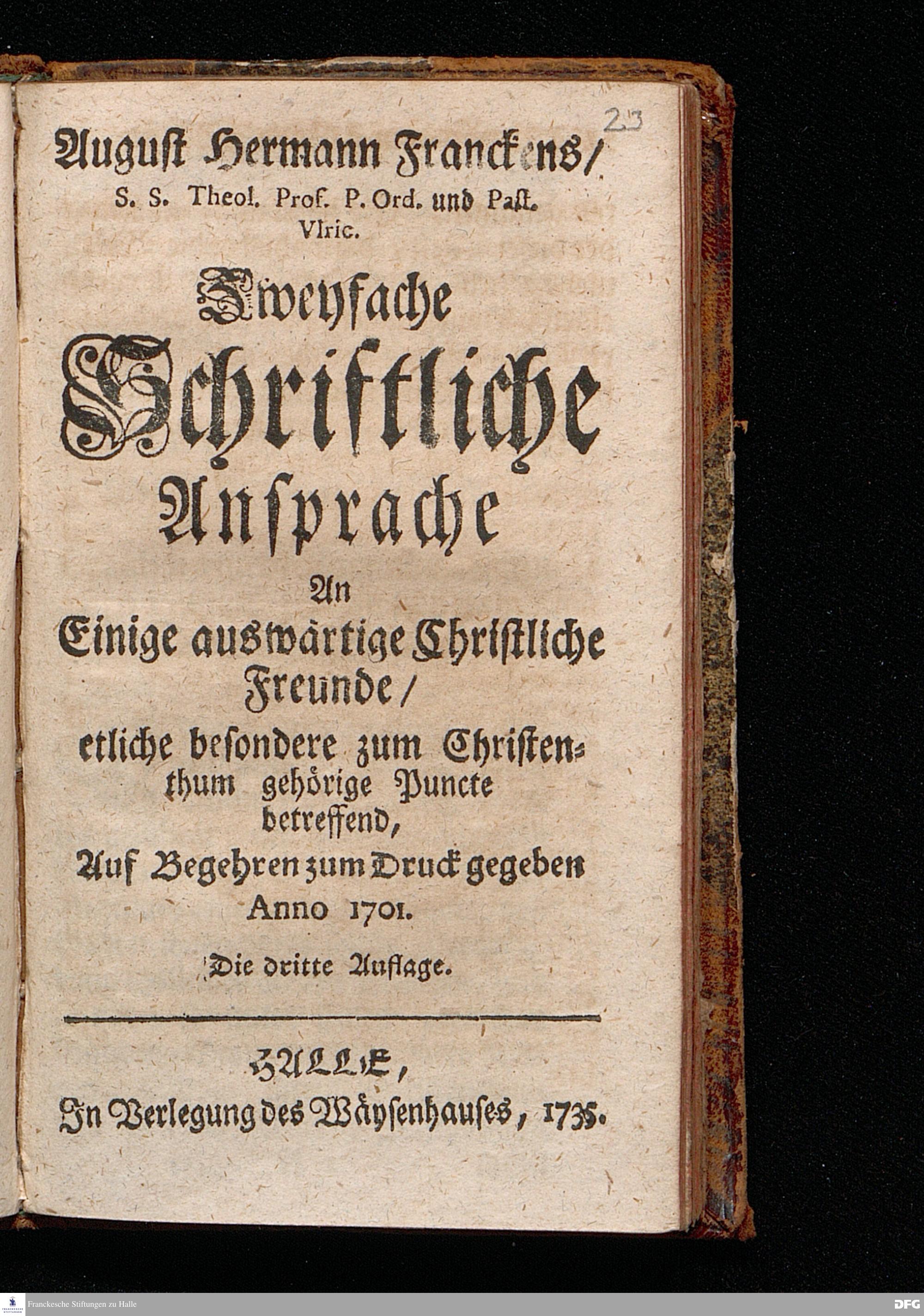 August Hermann Franckens / S.S.Theol.Prof.P.Ord. und Past.Vlric. Zweyfache Schriftliche Ansprache An Einige auswärtige Christliche Freunde / etliche besondere zum Christenthum gehörige Puncte betreffend, Auf Begehren zum Druck gegeben Anno 1701. Die dritte Auflage. HALLE, In Verlegung des Wäysenhauses, 1735