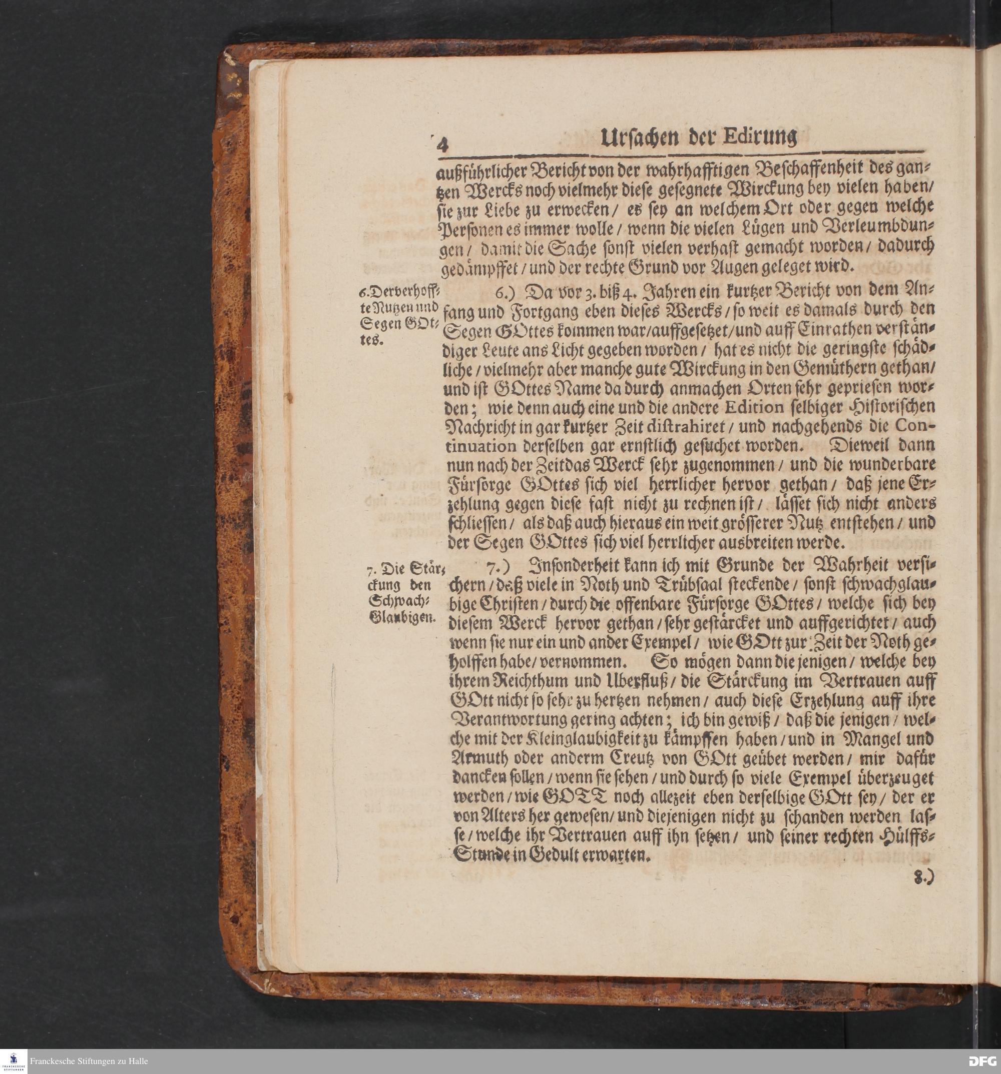 Die Fußstapffen Des noch lebenden und waltenden liebreichen und getreuen GOTTES / Zur Beschämung des Unglaubens / Und Stärckung des Glaubens Durch den Ausführlichen Bericht Vom Wäysen=Hause / Armen=Schulen / und übriger Armen=Verpflegung Zu Glaucha an Halle / Wie selbige fortgesetzet biß Ostern Anno 1702. Entdecket von August Hermann Francken S.Th.Prof.Ord.und Past.
