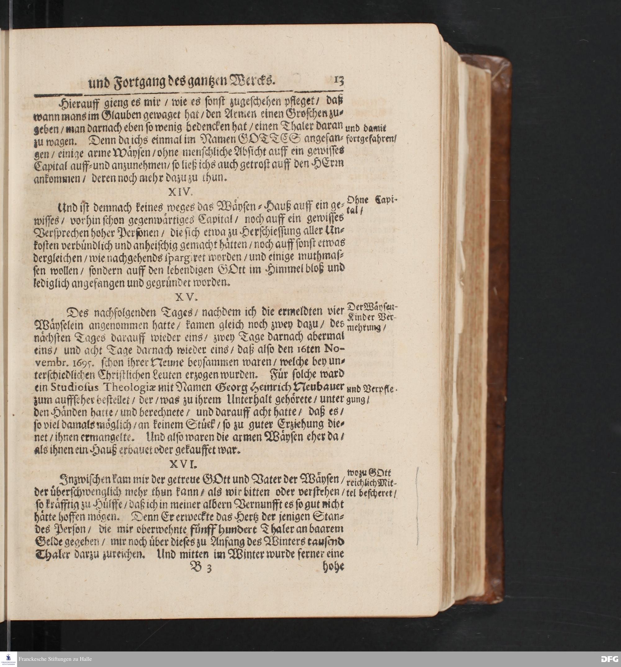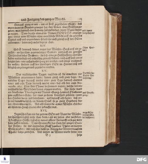Die Fußstapffen Des noch lebenden und waltenden liebreichen und getreuen GOTTES / Zur Beschämung des Unglaubens / Und Stärckung des Glaubens Durch den Ausführlichen Bericht Vom Wäysen=Hause / Armen=Schulen / und übriger Armen=Verpflegung Zu Glaucha an Halle / Wie selbige fortgesetzet biß Ostern Anno 1702. Entdecket von August Hermann Francken S.Th.Prof.Ord.und Past.