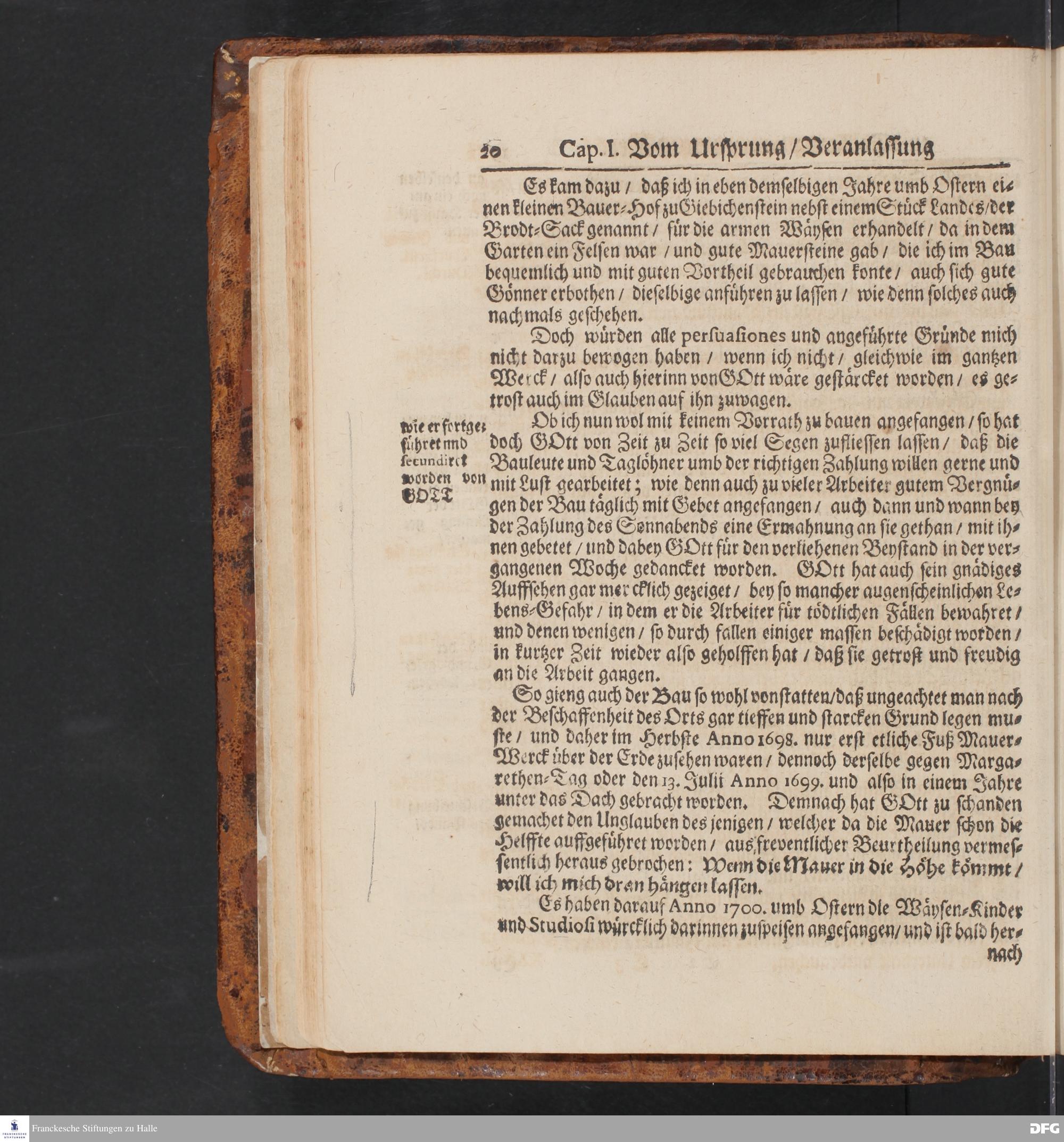 Die Fußstapffen Des noch lebenden und waltenden liebreichen und getreuen GOTTES / Zur Beschämung des Unglaubens / Und Stärckung des Glaubens Durch den Ausführlichen Bericht Vom Wäysen=Hause / Armen=Schulen / und übriger Armen=Verpflegung Zu Glaucha an Halle / Wie selbige fortgesetzet biß Ostern Anno 1702. Entdecket von August Hermann Francken S.Th.Prof.Ord.und Past.