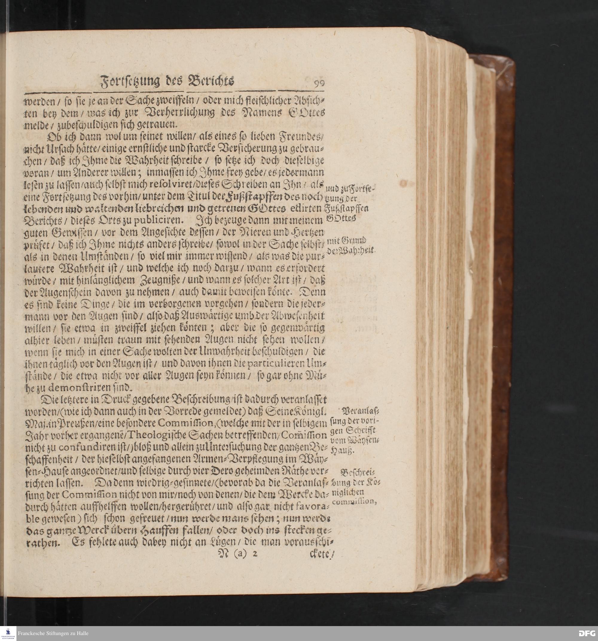 Fortsetzung Der Fußstapffen Des noch lebenden und waltenden liebreichen und getreuen GOTTES/ Zur Beschämung des Unglaubens/ Und Stärckung des Glaubens/ Durch den Ausführlichen Bericht Vom Wäysen=Hause/ Armen=Schulen und übrigen Armen=Verpflegung Zu Glaucha an Halle/ Wie selbige von Ostern 1701 biß auffs Ende desselbigen Jahres fortgesetzte/ In einem Send=Schreiben An einen auswärtigen Freund. [Halle: Waisenhaus, 1702]