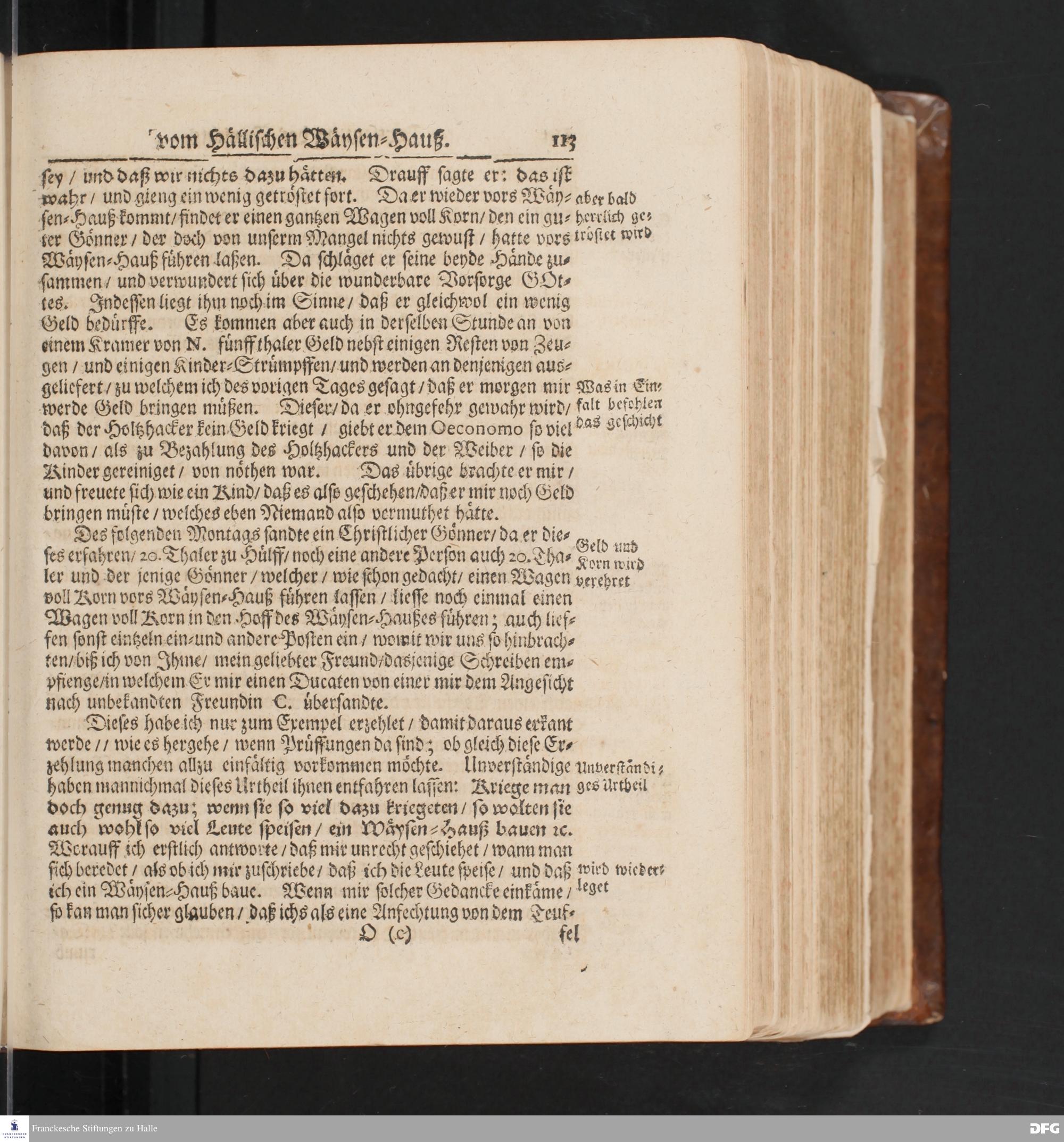Fortsetzung Der Fußstapffen Des noch lebenden und waltenden liebreichen und getreuen GOTTES/ Zur Beschämung des Unglaubens/ Und Stärckung des Glaubens/ Durch den Ausführlichen Bericht Vom Wäysen=Hause/ Armen=Schulen und übrigen Armen=Verpflegung Zu Glaucha an Halle/ Wie selbige von Ostern 1701 biß auffs Ende desselbigen Jahres fortgesetzte/ In einem Send=Schreiben An einen auswärtigen Freund. [Halle: Waisenhaus, 1702]