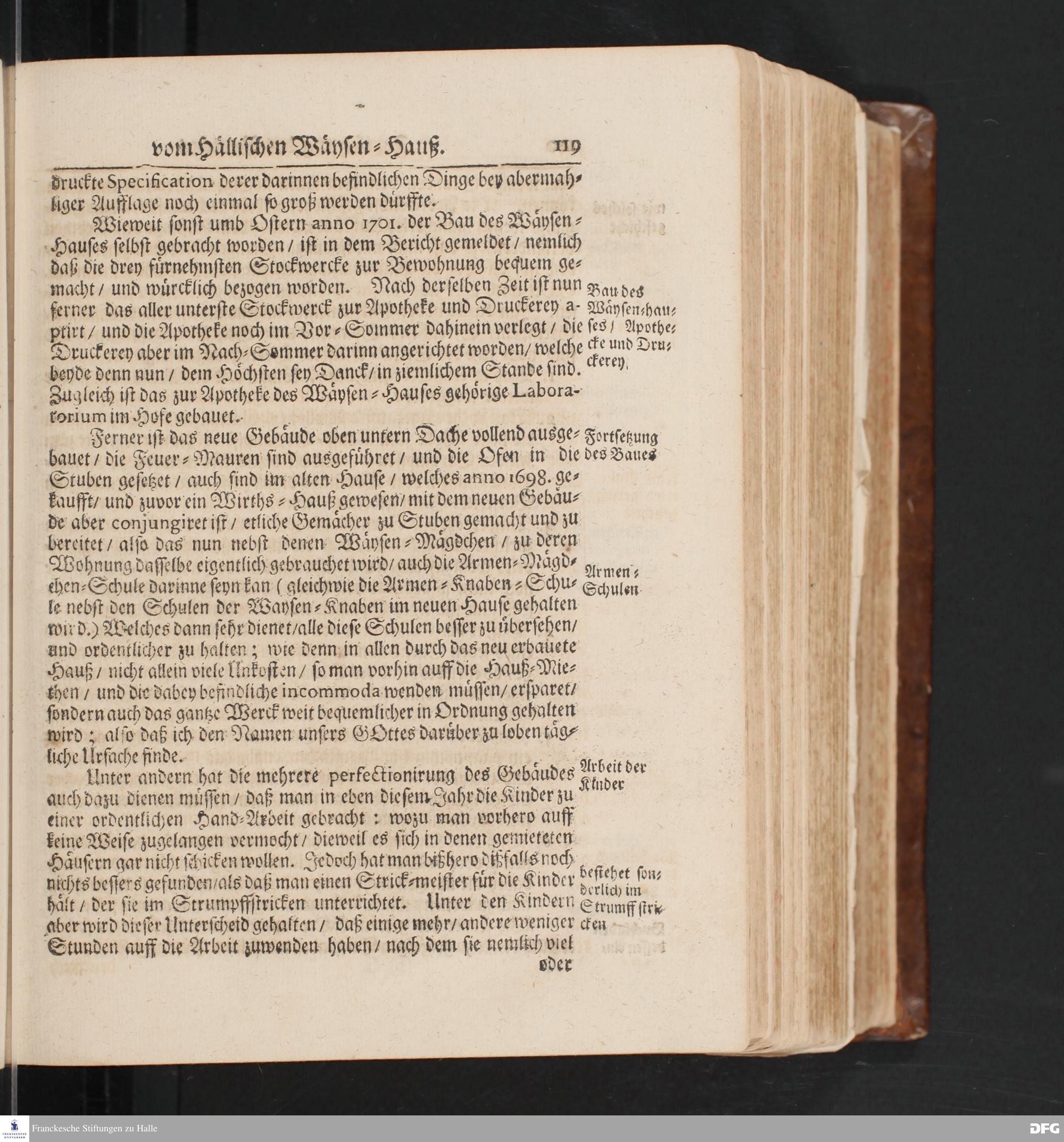 Fortsetzung Der Fußstapffen Des noch lebenden und waltenden liebreichen und getreuen GOTTES/ Zur Beschämung des Unglaubens/ Und Stärckung des Glaubens/ Durch den Ausführlichen Bericht Vom Wäysen=Hause/ Armen=Schulen und übrigen Armen=Verpflegung Zu Glaucha an Halle/ Wie selbige von Ostern 1701 biß auffs Ende desselbigen Jahres fortgesetzte/ In einem Send=Schreiben An einen auswärtigen Freund. [Halle: Waisenhaus, 1702]