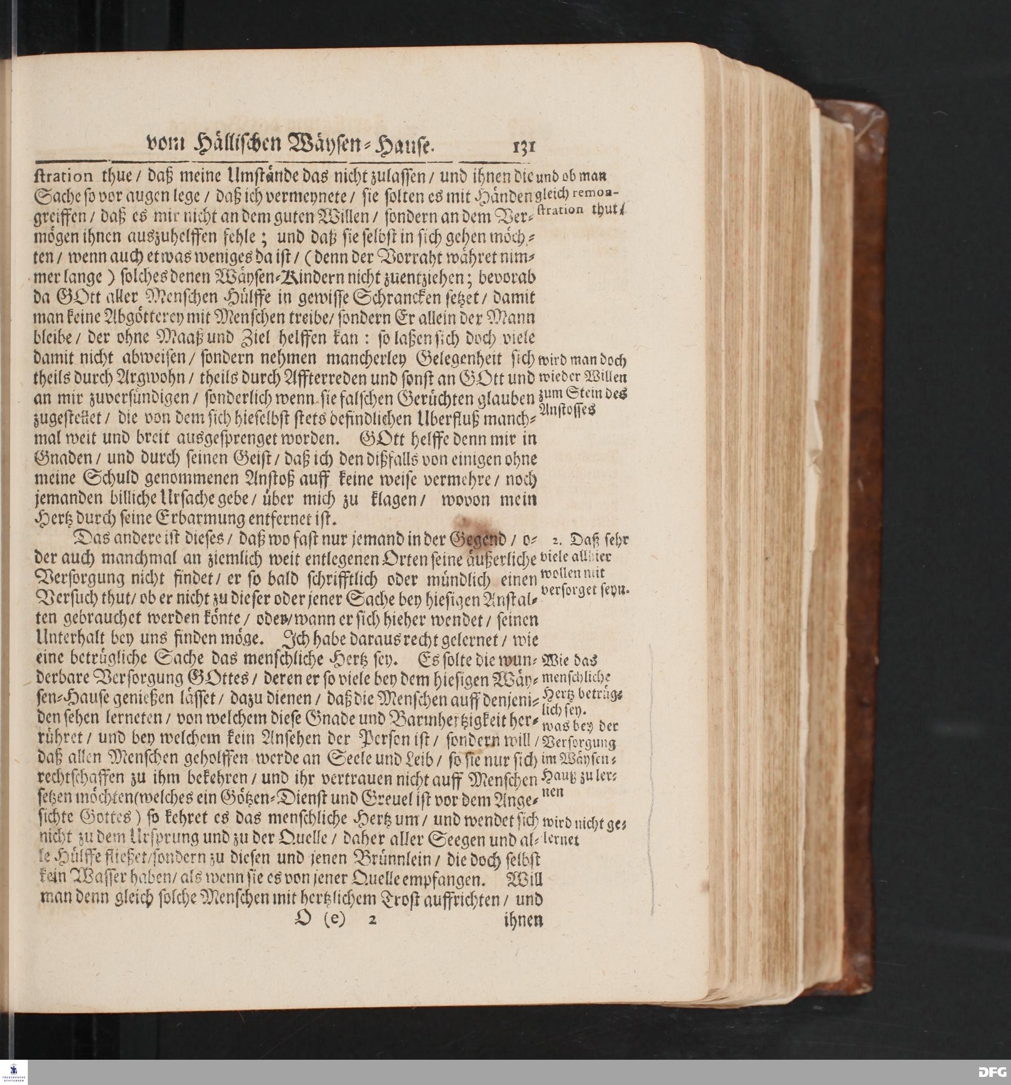 Fortsetzung Der Fußstapffen Des noch lebenden und waltenden liebreichen und getreuen GOTTES/ Zur Beschämung des Unglaubens/ Und Stärckung des Glaubens/ Durch den Ausführlichen Bericht Vom Wäysen=Hause/ Armen=Schulen und übrigen Armen=Verpflegung Zu Glaucha an Halle/ Wie selbige von Ostern 1701 biß auffs Ende desselbigen Jahres fortgesetzte/ In einem Send=Schreiben An einen auswärtigen Freund. [Halle: Waisenhaus, 1702]