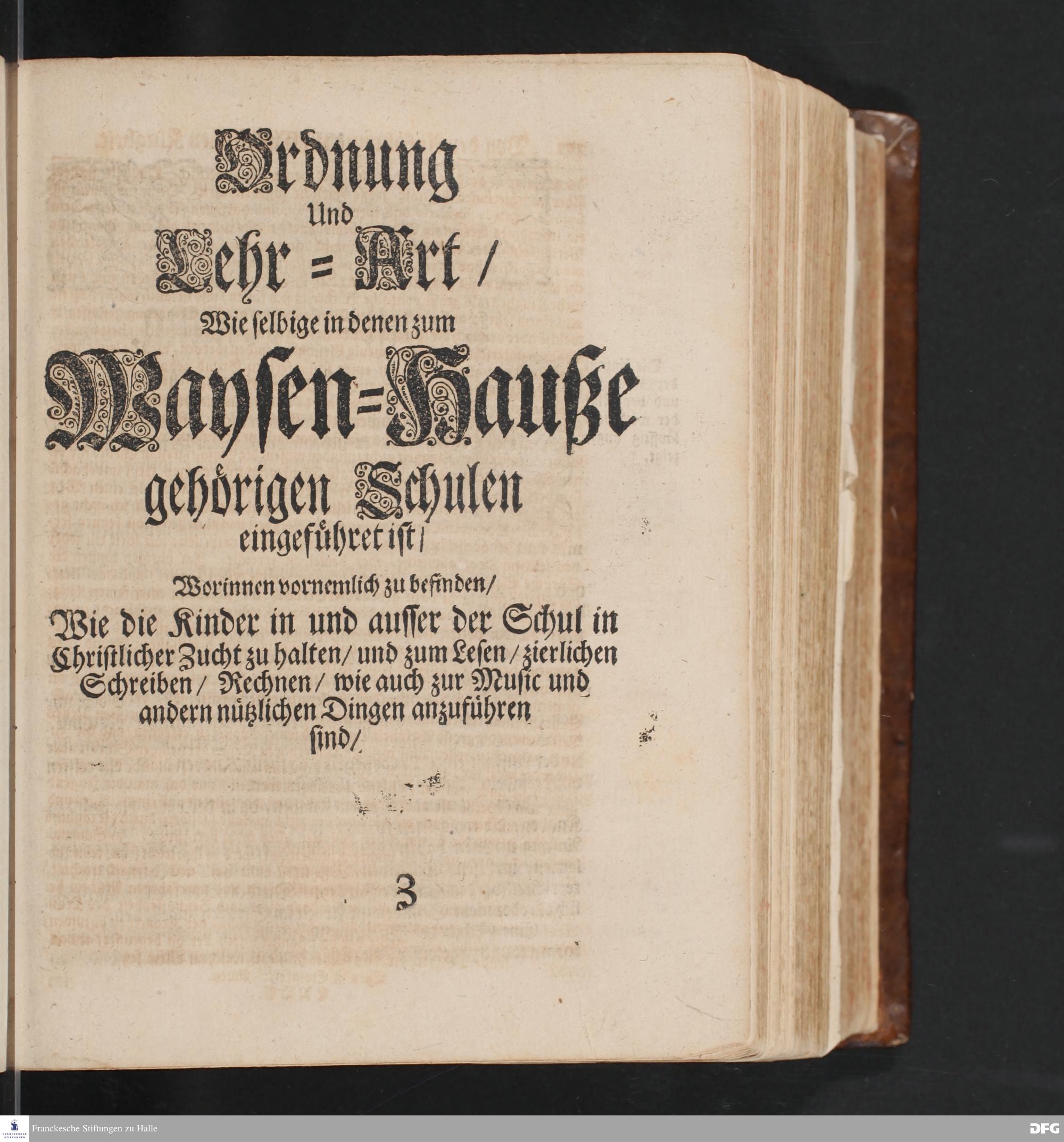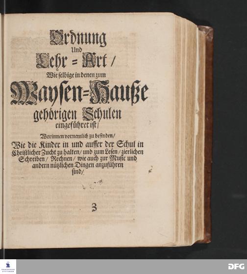 Ordnung Und Lehr=Art/ Wie selbige in denen zum Waysen=Hauße gehörigen Schulen eingeführet ist / Worinnen vornemlich zu befinden/ Wie die Kinder in und ausser der Schul in Christlicher Zucht zu halten/ zum Lesen /zierlichen Schreiben/ Rechnen/ wie auch zur Music und andern nützlichen Dingen anzuführen sind/.