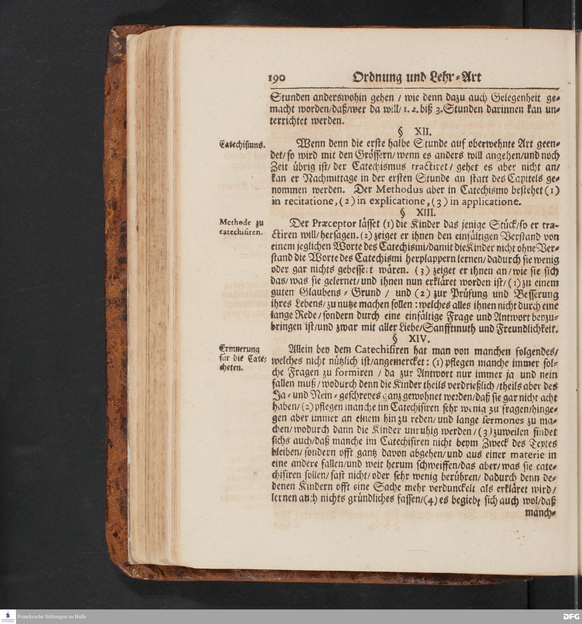 Ordnung Und Lehr=Art/ Wie selbige in denen zum Waysen=Hauße gehörigen Schulen eingeführet ist / Worinnen vornemlich zu befinden/ Wie die Kinder in und ausser der Schul in Christlicher Zucht zu halten/ zum Lesen /zierlichen Schreiben/ Rechnen/ wie auch zur Music und andern nützlichen Dingen anzuführen sind/.
