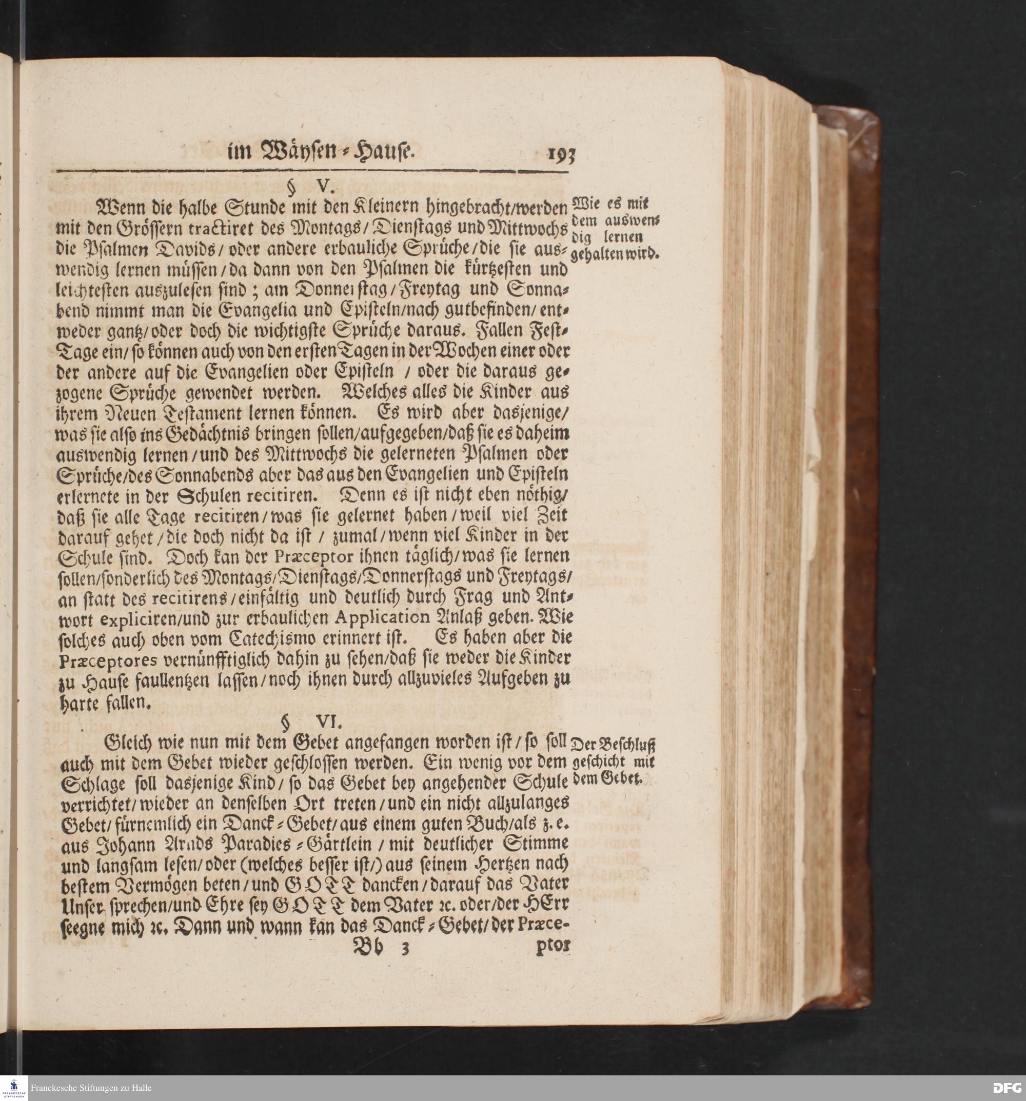 Ordnung Und Lehr=Art/ Wie selbige in denen zum Waysen=Hauße gehörigen Schulen eingeführet ist / Worinnen vornemlich zu befinden/ Wie die Kinder in und ausser der Schul in Christlicher Zucht zu halten/ zum Lesen /zierlichen Schreiben/ Rechnen/ wie auch zur Music und andern nützlichen Dingen anzuführen sind/.