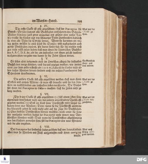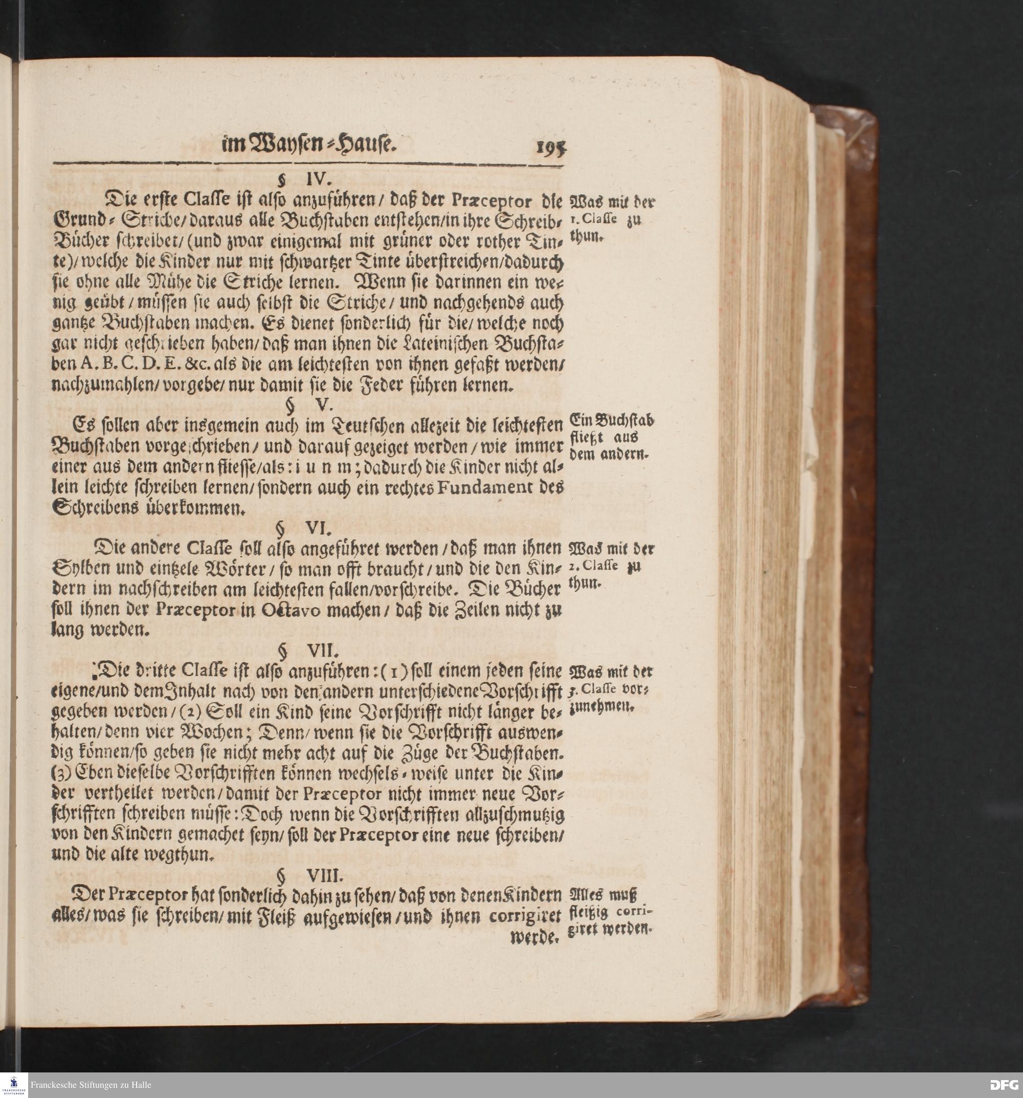 Ordnung Und Lehr=Art/ Wie selbige in denen zum Waysen=Hauße gehörigen Schulen eingeführet ist / Worinnen vornemlich zu befinden/ Wie die Kinder in und ausser der Schul in Christlicher Zucht zu halten/ zum Lesen /zierlichen Schreiben/ Rechnen/ wie auch zur Music und andern nützlichen Dingen anzuführen sind/.