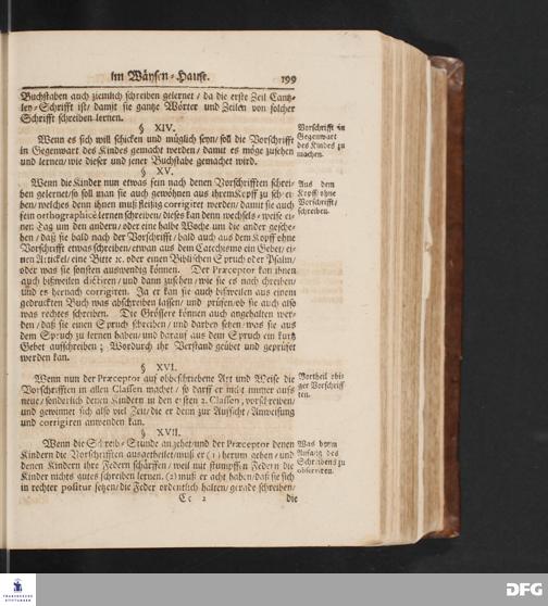 Ordnung Und Lehr=Art/ Wie selbige in denen zum Waysen=Hauße gehörigen Schulen eingeführet ist / Worinnen vornemlich zu befinden/ Wie die Kinder in und ausser der Schul in Christlicher Zucht zu halten/ zum Lesen /zierlichen Schreiben/ Rechnen/ wie auch zur Music und andern nützlichen Dingen anzuführen sind/.
