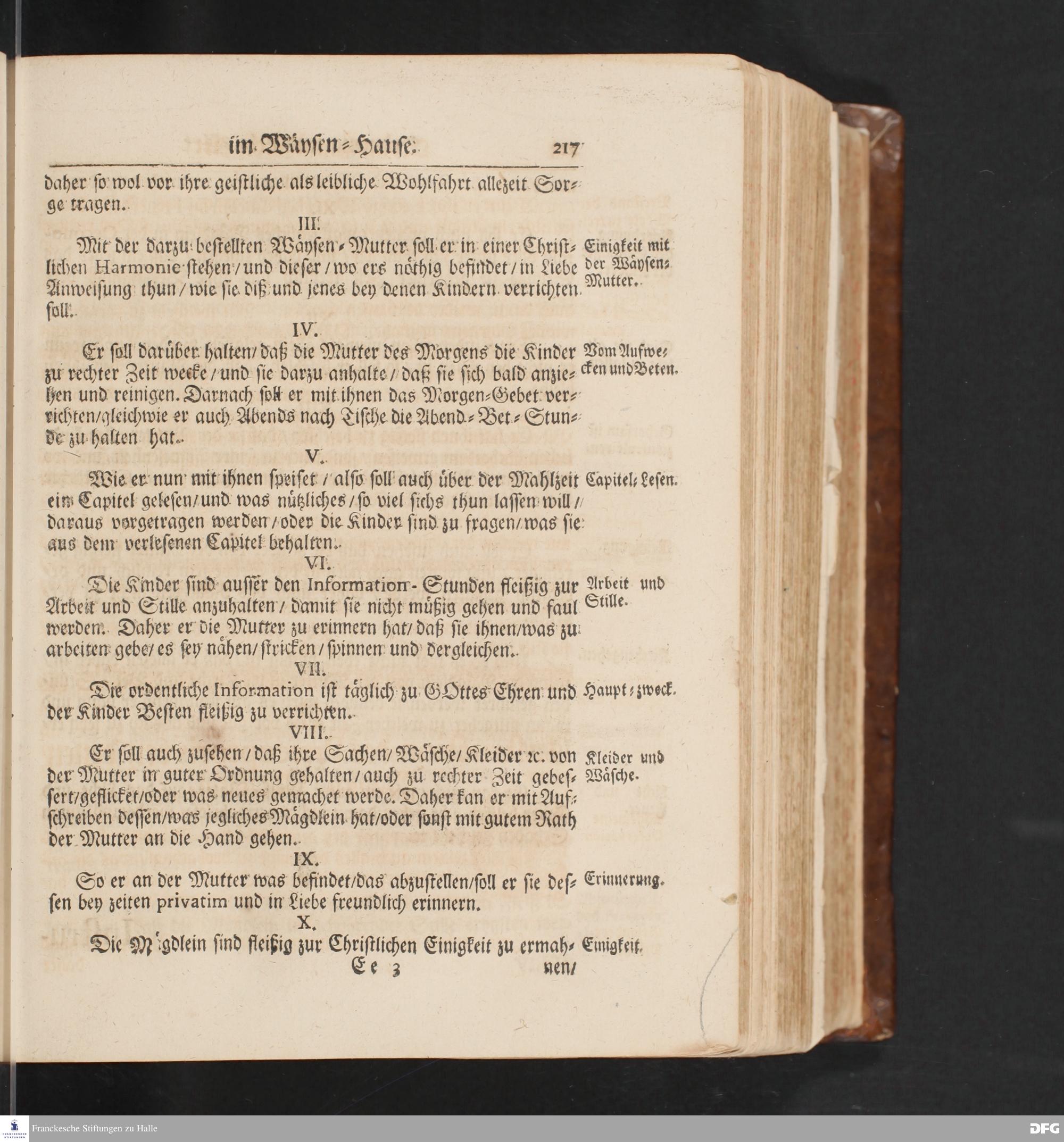 Ordnung Und Lehr=Art/ Wie selbige in denen zum Waysen=Hauße gehörigen Schulen eingeführet ist / Worinnen vornemlich zu befinden/ Wie die Kinder in und ausser der Schul in Christlicher Zucht zu halten/ zum Lesen /zierlichen Schreiben/ Rechnen/ wie auch zur Music und andern nützlichen Dingen anzuführen sind/.
