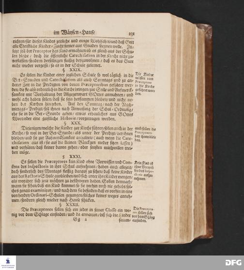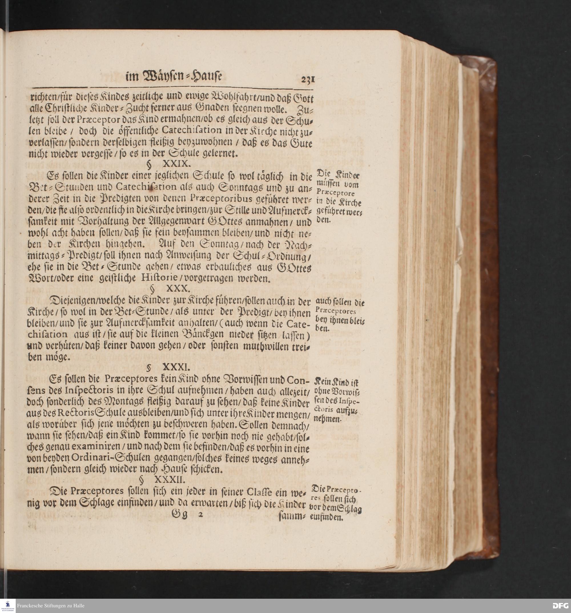 Ordnung Und Lehr=Art/ Wie selbige in denen zum Waysen=Hauße gehörigen Schulen eingeführet ist / Worinnen vornemlich zu befinden/ Wie die Kinder in und ausser der Schul in Christlicher Zucht zu halten/ zum Lesen /zierlichen Schreiben/ Rechnen/ wie auch zur Music und andern nützlichen Dingen anzuführen sind/.