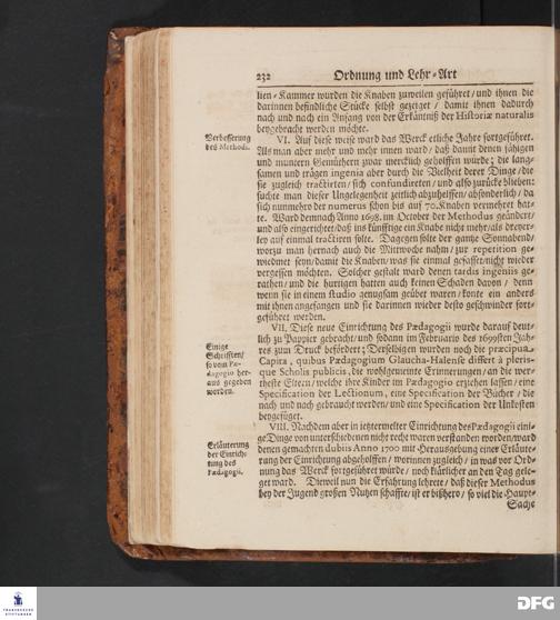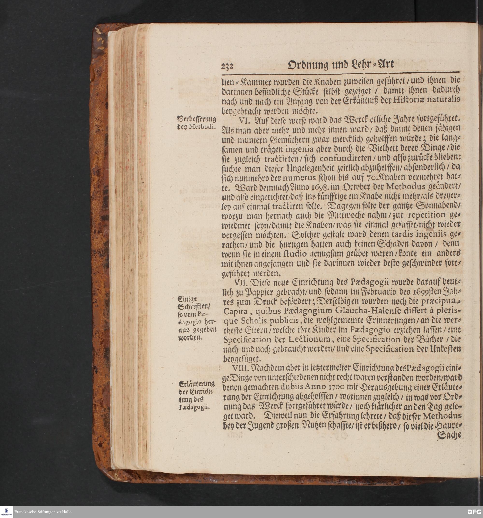 Ordnung und Lehr=Art / Wie selbige in dem PAEDAGOGIO zu Glaucha an Halle eingeführet ist: Worinnen vornemlich zu befinden / Wie die Jugend / nebst der Anweisung zum Christenthum / in Sprachen und Wissenschafften / als in der Lateinischen / Griechischen / Ebräischen und Französischen Sprache / wie auch in Calligraphia, Geographia, Historia, Arithmetica, Geometria, Oratoria, Theologia, und in denen Fundamentis Astronomicis, Botanicis, Anatomicis &c.auf eine kurtze und leichte methode zu unterrichten / und zu denen studiis Academicis zu præpariren sey
