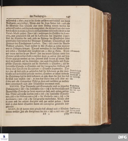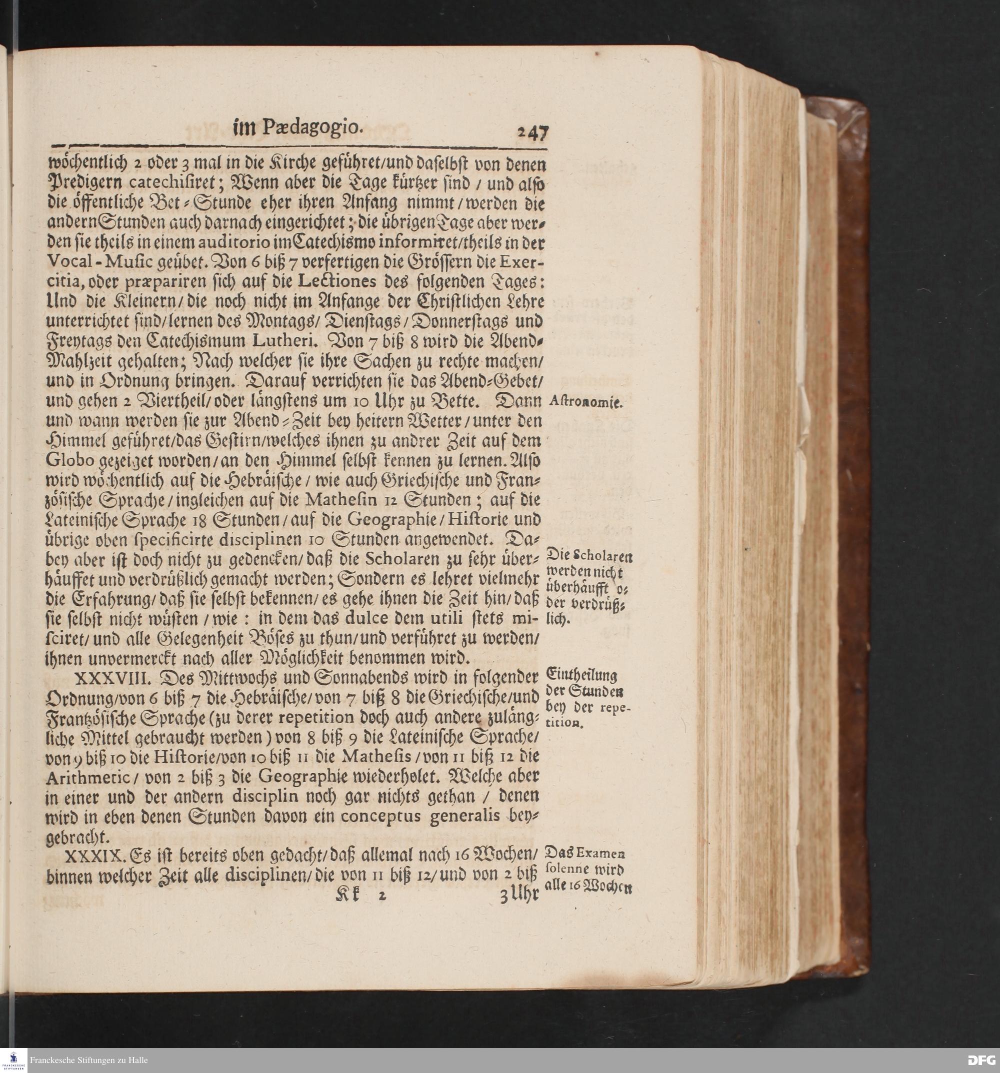Ordnung und Lehr=Art / Wie selbige in dem PAEDAGOGIO zu Glaucha an Halle eingeführet ist: Worinnen vornemlich zu befinden / Wie die Jugend / nebst der Anweisung zum Christenthum / in Sprachen und Wissenschafften / als in der Lateinischen / Griechischen / Ebräischen und Französischen Sprache / wie auch in Calligraphia, Geographia, Historia, Arithmetica, Geometria, Oratoria, Theologia, und in denen Fundamentis Astronomicis, Botanicis, Anatomicis &c.auf eine kurtze und leichte methode zu unterrichten / und zu denen studiis Academicis zu præpariren sey