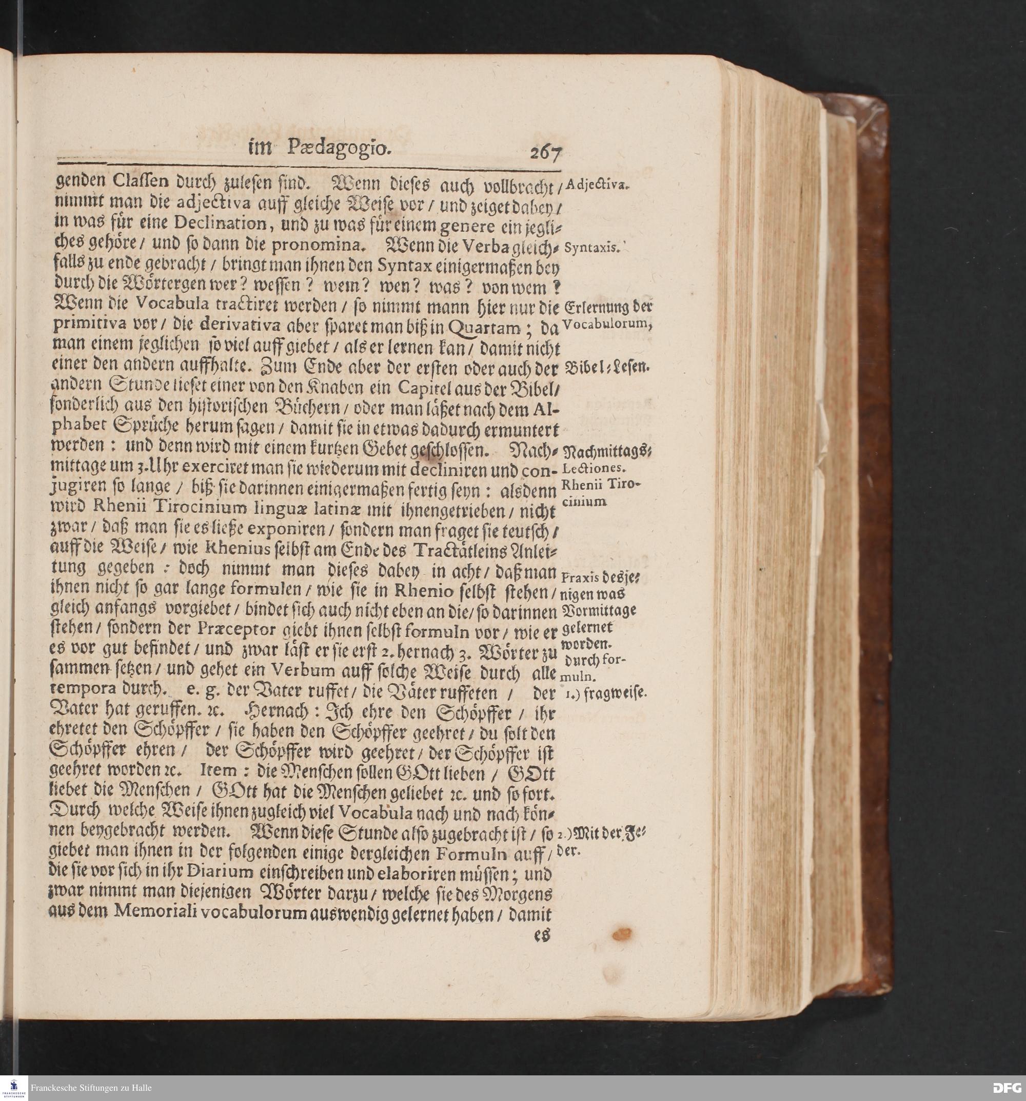 Ordnung und Lehr=Art / Wie selbige in dem PAEDAGOGIO zu Glaucha an Halle eingeführet ist: Worinnen vornemlich zu befinden / Wie die Jugend / nebst der Anweisung zum Christenthum / in Sprachen und Wissenschafften / als in der Lateinischen / Griechischen / Ebräischen und Französischen Sprache / wie auch in Calligraphia, Geographia, Historia, Arithmetica, Geometria, Oratoria, Theologia, und in denen Fundamentis Astronomicis, Botanicis, Anatomicis &c.auf eine kurtze und leichte methode zu unterrichten / und zu denen studiis Academicis zu præpariren sey