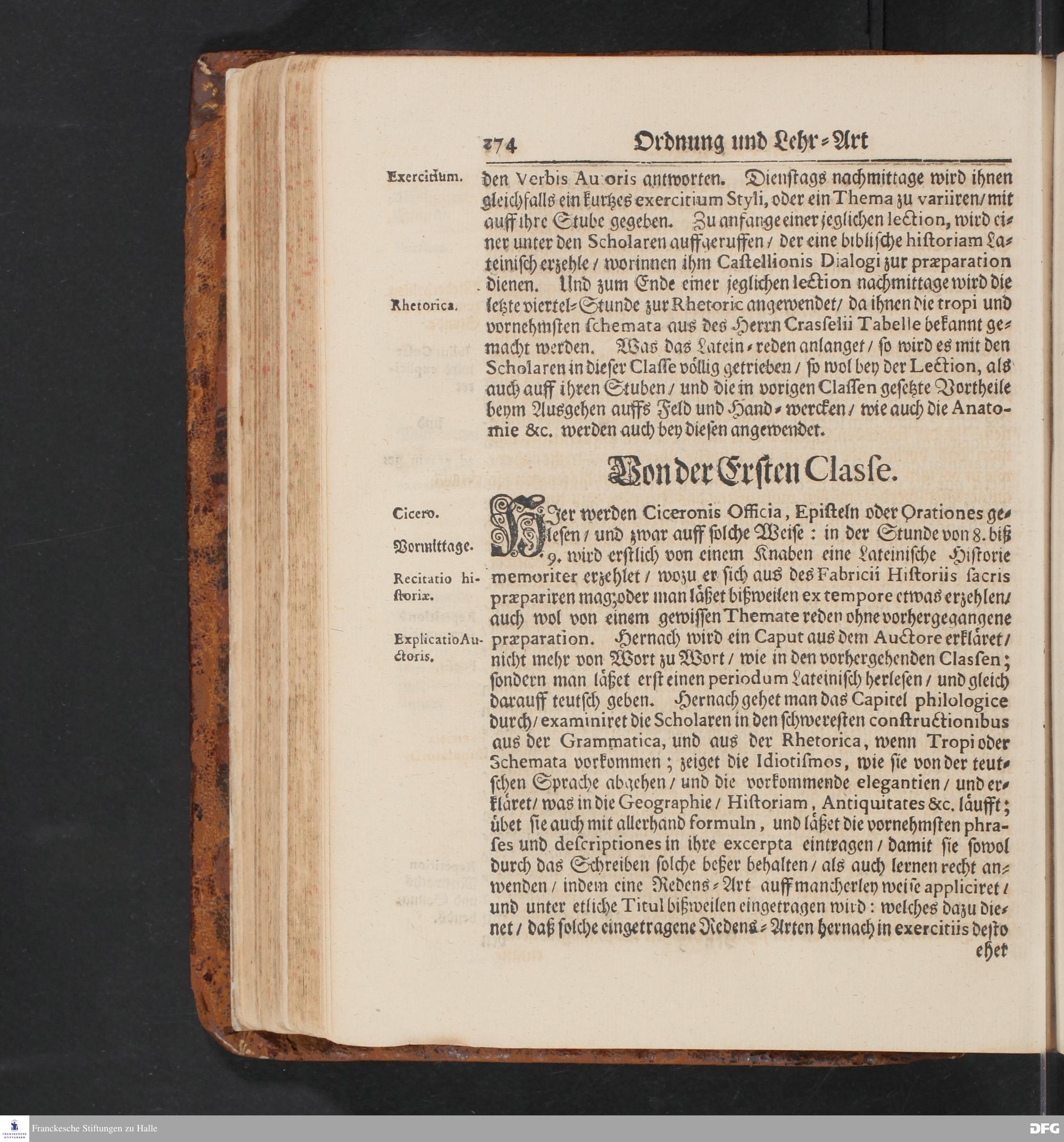 Ordnung und Lehr=Art / Wie selbige in dem PAEDAGOGIO zu Glaucha an Halle eingeführet ist: Worinnen vornemlich zu befinden / Wie die Jugend / nebst der Anweisung zum Christenthum / in Sprachen und Wissenschafften / als in der Lateinischen / Griechischen / Ebräischen und Französischen Sprache / wie auch in Calligraphia, Geographia, Historia, Arithmetica, Geometria, Oratoria, Theologia, und in denen Fundamentis Astronomicis, Botanicis, Anatomicis &c.auf eine kurtze und leichte methode zu unterrichten / und zu denen studiis Academicis zu præpariren sey