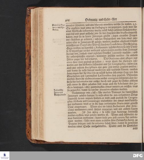 Ordnung und Lehr=Art / Wie selbige in dem PAEDAGOGIO zu Glaucha an Halle eingeführet ist: Worinnen vornemlich zu befinden / Wie die Jugend / nebst der Anweisung zum Christenthum / in Sprachen und Wissenschafften / als in der Lateinischen / Griechischen / Ebräischen und Französischen Sprache / wie auch in Calligraphia, Geographia, Historia, Arithmetica, Geometria, Oratoria, Theologia, und in denen Fundamentis Astronomicis, Botanicis, Anatomicis &c.auf eine kurtze und leichte methode zu unterrichten / und zu denen studiis Academicis zu præpariren sey